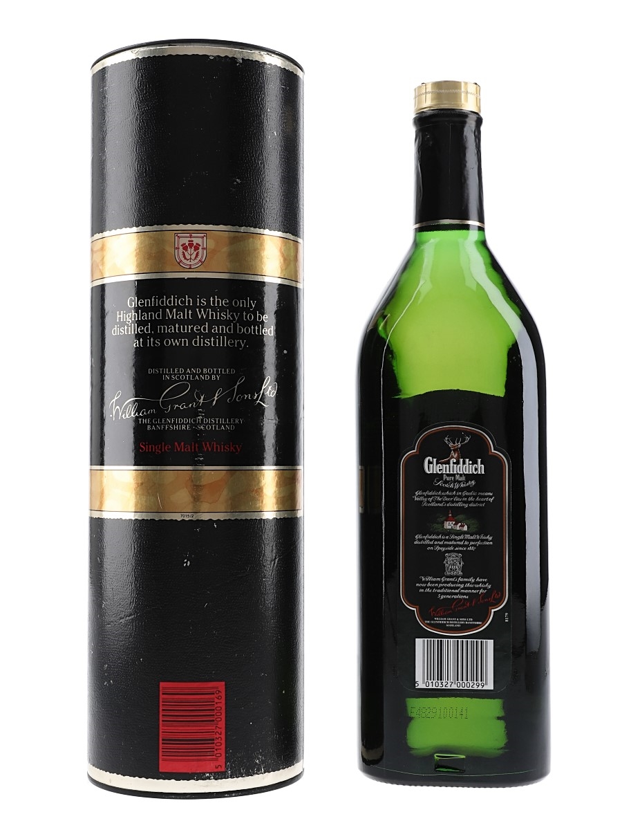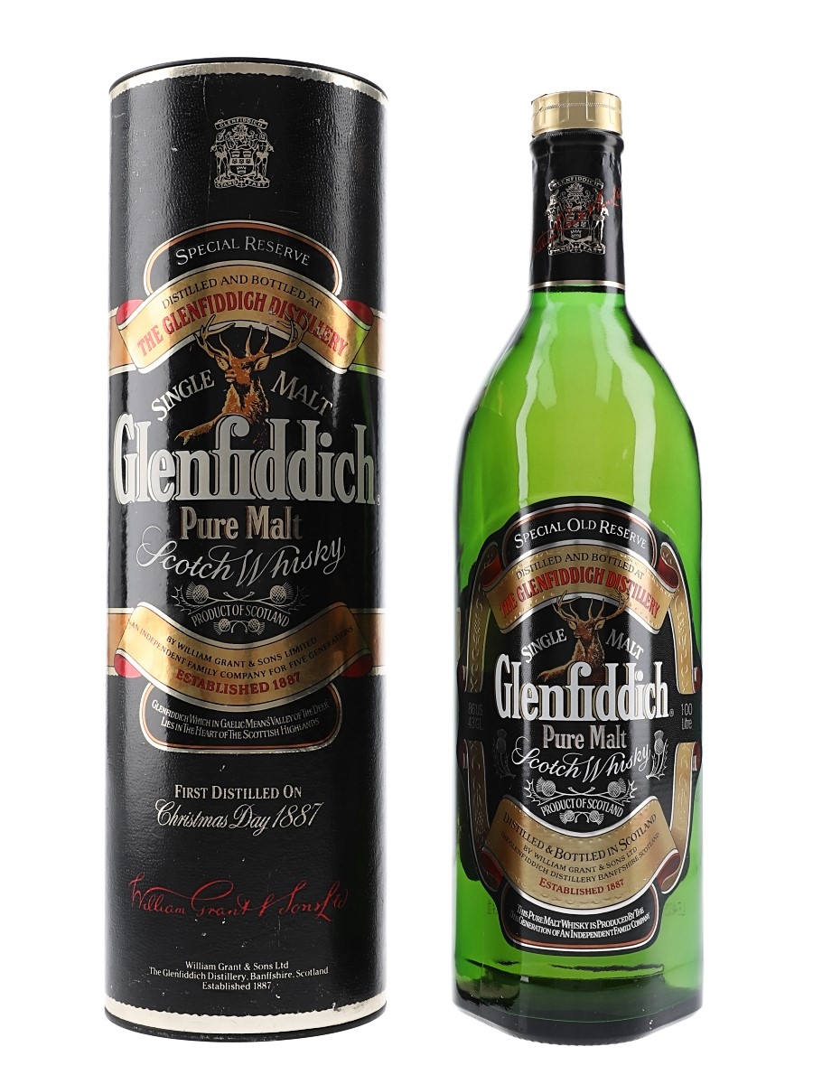 A litre bottle of Glenfiddich Special Old Reserve Pure Speyside Single Malt Scotch Whisky produced by William Grant & Sons Ltd. We estimate this was bottled in the 1990s.