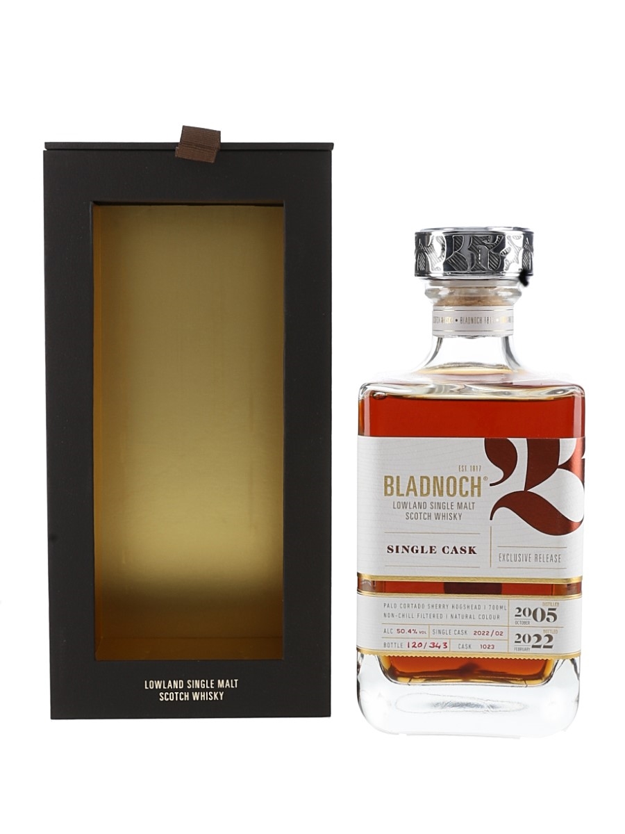 A bottle of Bladnoch Single Cask Exclusive Release Lowland Single Malt Scotch Whisky. This was distilled in October 2005, matured in a single Bourbon cask and bottled in February 2022 at a cask strength of 50.4% ABV.