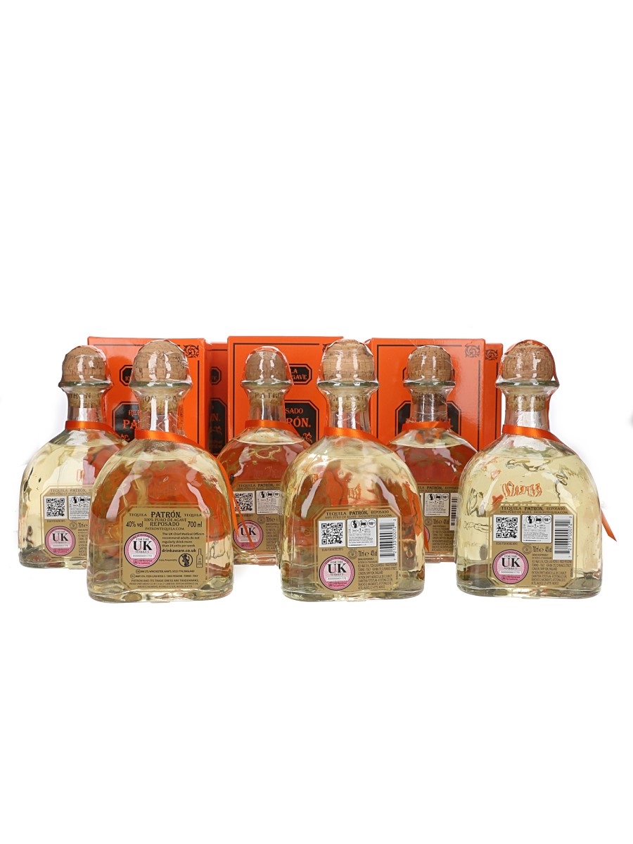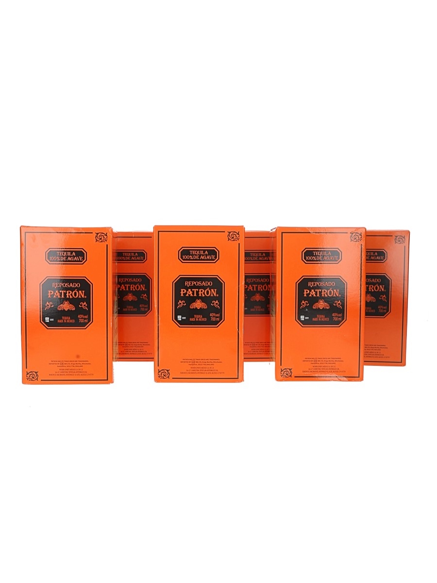 This lot contains six bottles of Patron Reposado, a premium Tequila made from 100% Weber blue agave.
