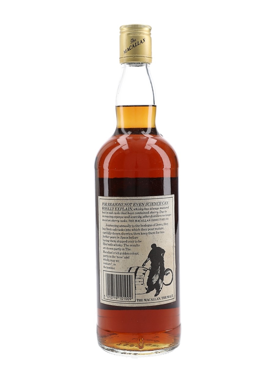 A bottle of The Macallan 10 Year Old Single Highland Malt Scotch Whisky, matured in sherry wood. We estimate this was bottled in the 1980s.