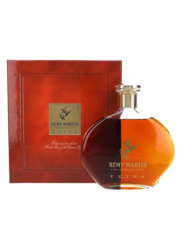 A bottle of Rémy Martin Extra Fine Champagne Cognac. This is produced from grapes grown in Cognac's top two regions, the Grande Champagne and Petite Champagne districts, and is a blend of brandies aged for between 20 and 50 years in cask before bottling and blending.