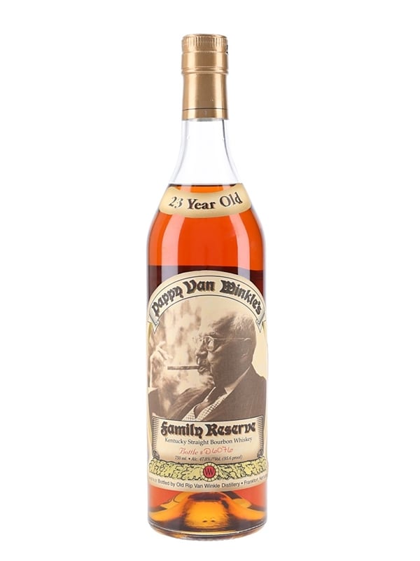 A bottle of Pappy Van Winkle's 23 Year Old Family Reserve Kentucky Straight Bourbon Whiskey, bottled by Old Rip Van Winkle Distillery, Frankfort.