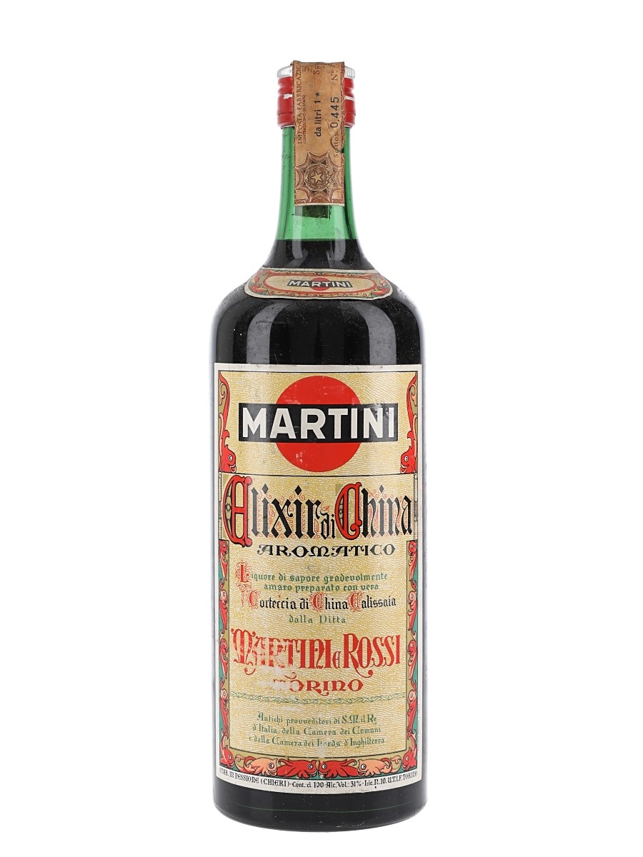 A litre bottle of Martini Elixir China, a herbal liqueur flavoured with cinchona bark. We estimate this was bottled in the 1960s.