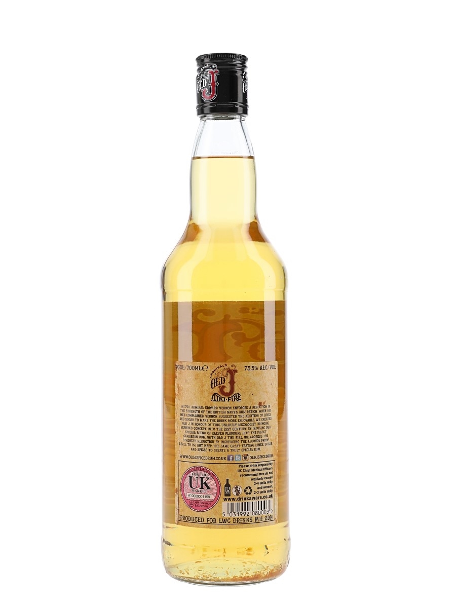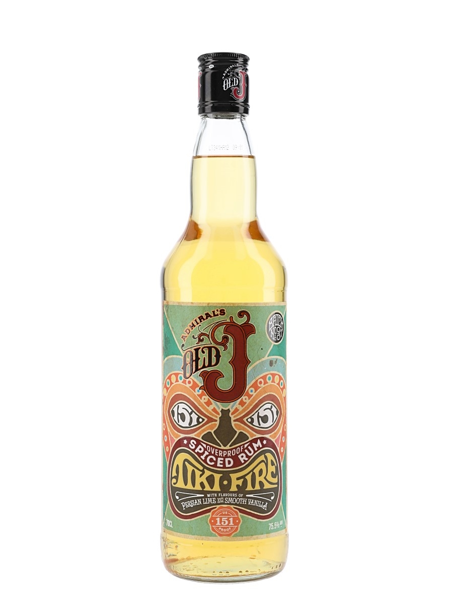 A bottle of Admiral's Old J Tiki-Fire Overproof Spiced Rum. A blend of Caribbean rums flavoured with Persian lime and vanilla. This was bottled at 75.5% ABV.