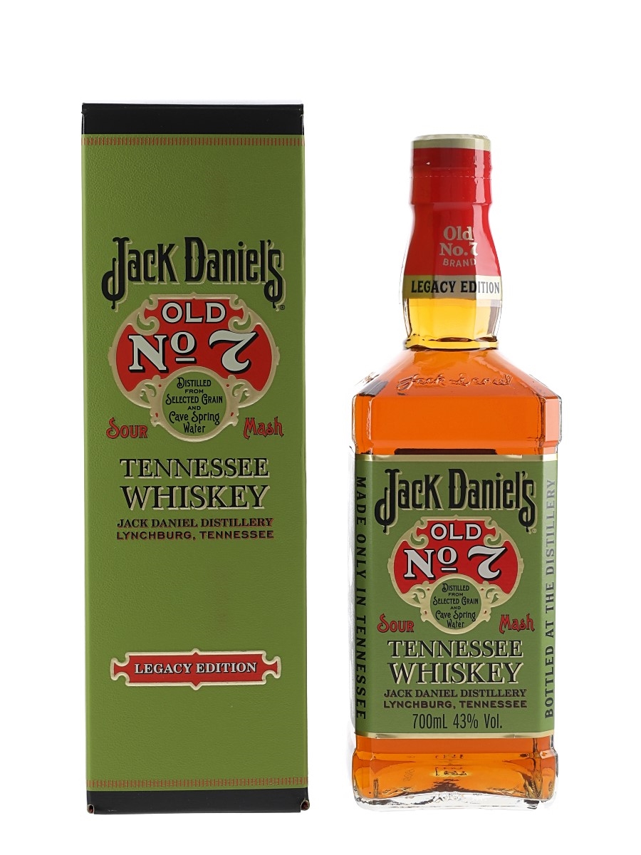 A bottle of Jack Daniel's Old No.7 Sour Mash Tennessee Whiskey, the first bottling in the Legacy Edition series, reminiscent of an early 1900s design.