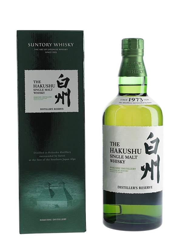 A bottle of Hakushu Distiller's Reserve Single Malt Whisky, first released in 2014 at the same time as the Yamazaki Distiller's Reserve. This was imported to the UK by Morrison Bowmore.