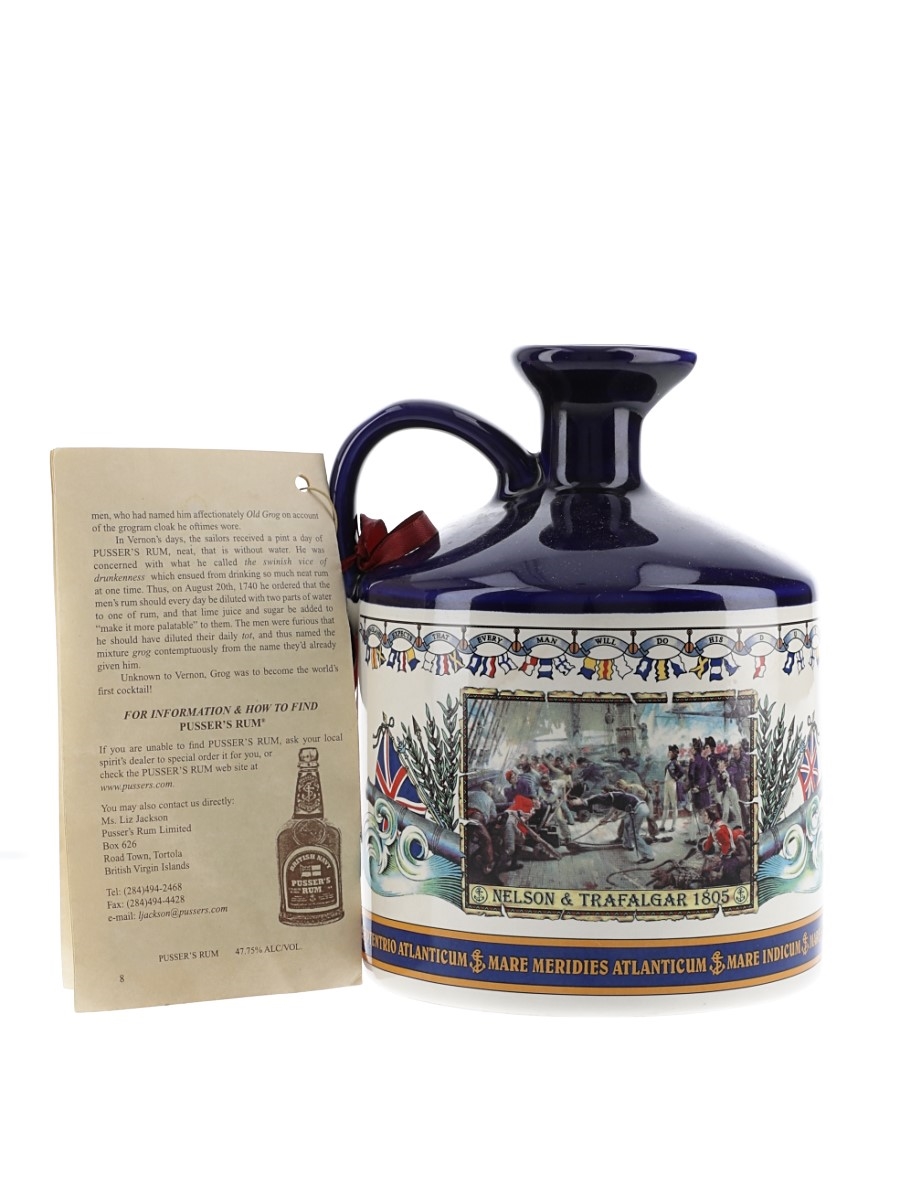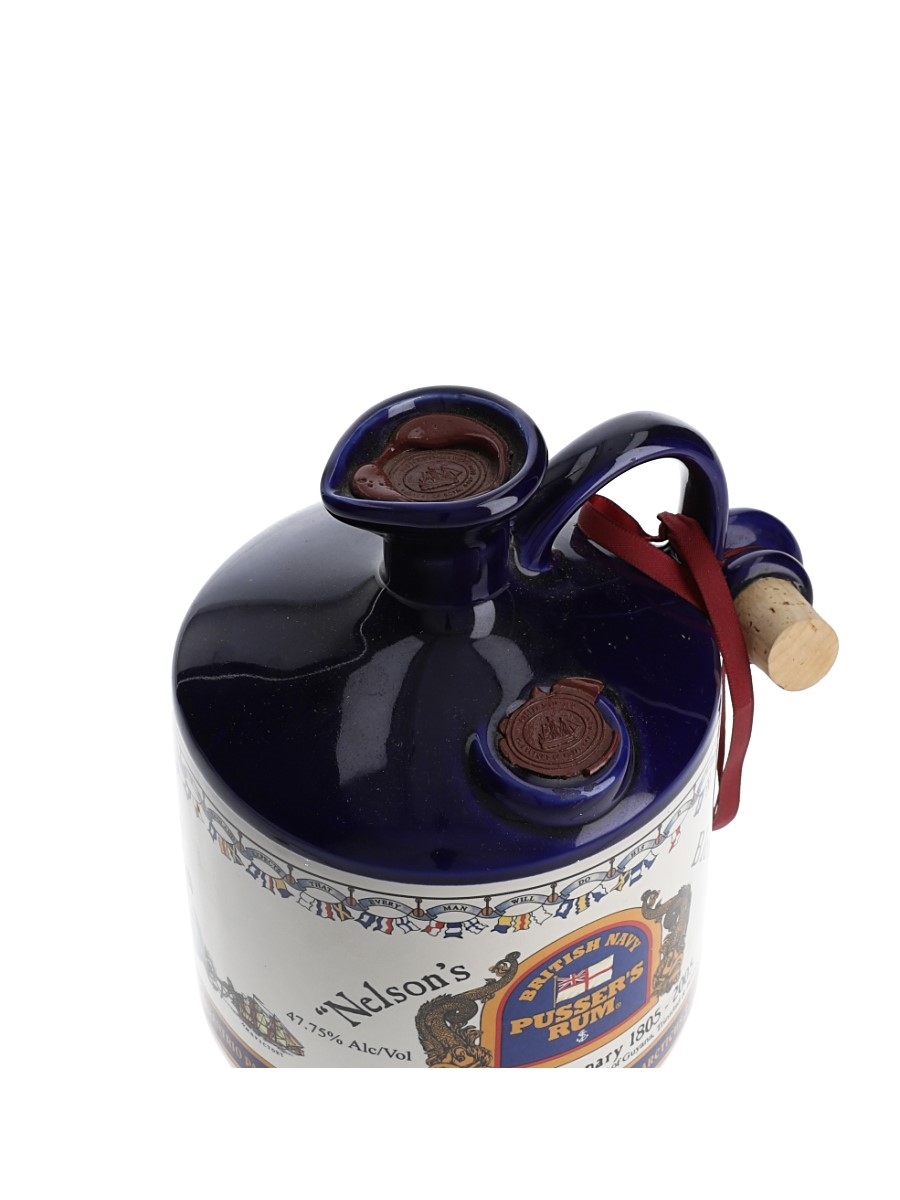 A hand cast stoneware flagon of Pusser's British Navy rum Nelson's Blood Flagon, product of Guyana, Trinidad and British Virgin Islands. This was bottled by Pusser's Ltd., British Virgin Islands.