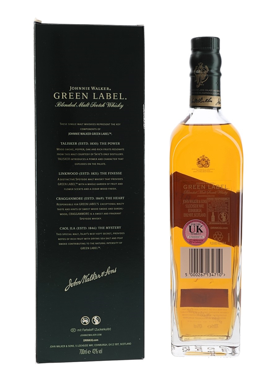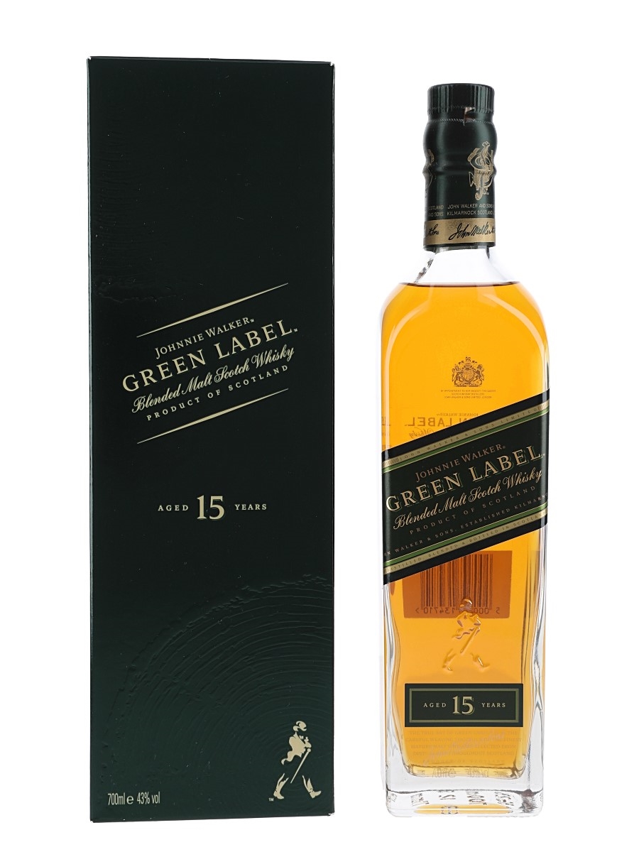 A bottle of Johnnie Walker Green Label 15 Year Old Blended Malt Scotch Whisky.