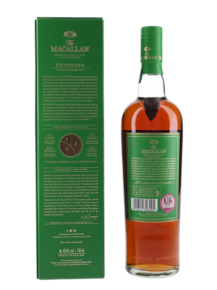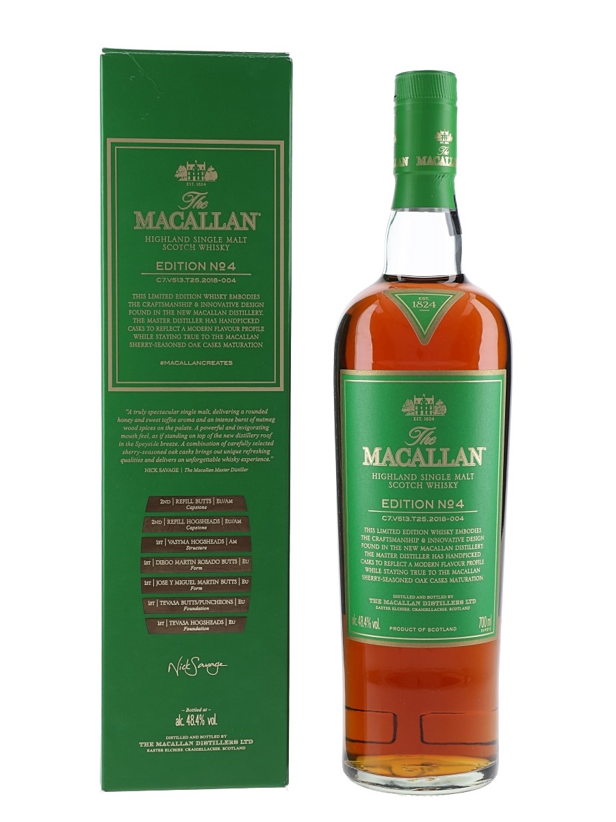 A bottle of The Macallan Edition No.4 Highland Single Malt Scotch Whisky bottled at 48.4% ABV. This is a limited edition matured in seven distinct cask types selected by Master Distiller Nick Savage.