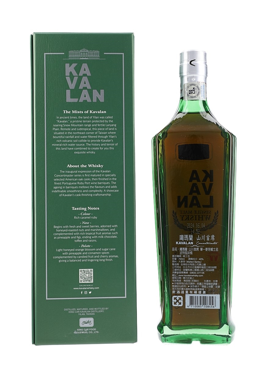 A bottle of Kavalan Concertmaster Port Cask Finish Single Malt Whisky. The bottling code indicates this was bottled on 4 June 2024.