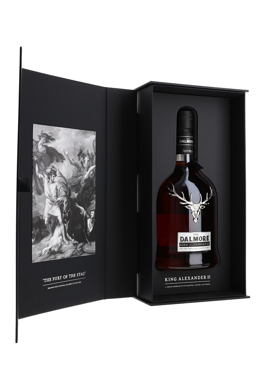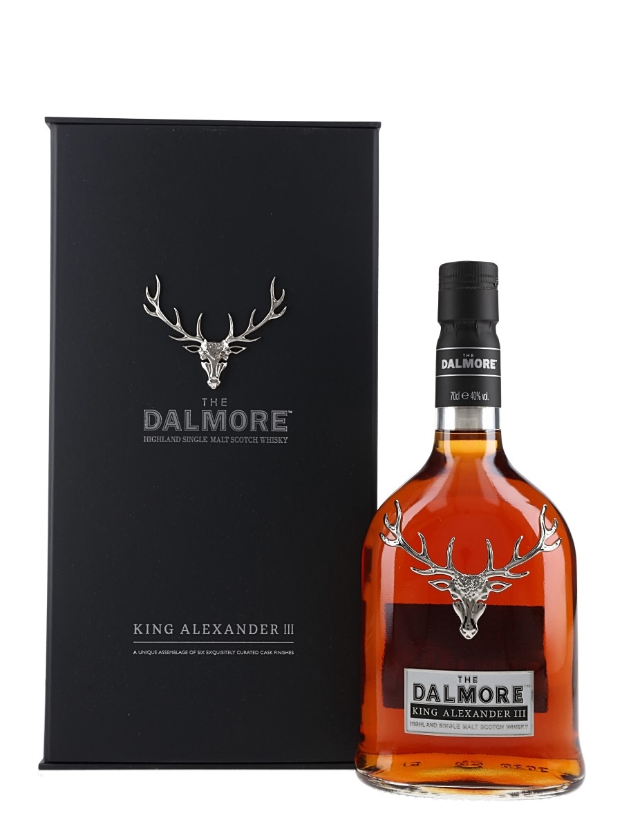 A bottle of The Dalmore King Alexander III Highland Single Malt Scotch Whisky, a combination of whiskies matured in French wine casks, Madeira drums, sherry butts, Marsala barrels, port pipes and bourbon barrels from Kentucky, selected by Master Distiller Richard Paterson.