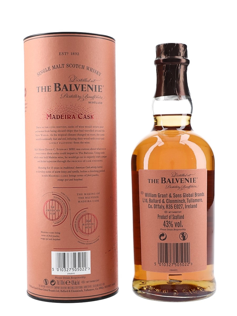 A bottle of Balvenie 15 Year Old Single Malt Scotch Whisky. This was first matured in traditional American oak whisky barrels before being transferred to Madeira casks for an extra maturation period.