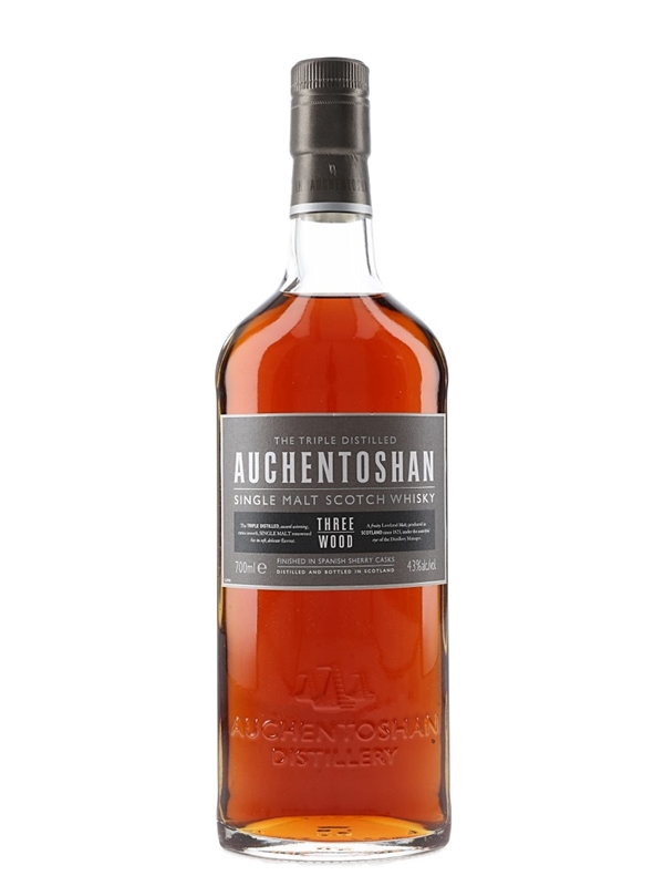 A bottle of Auchentoshan Three Wood Single Malt Scotch Whisky, matured in a combination of bourbon, oloroso and PX sherry casks and bottled at 43% ABV.