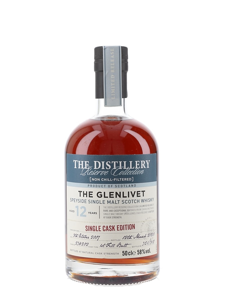 A 50cl bottle of The Glenlivet 12 Year Old Single Malt Scotch Whisky. This was distilled on 9 October 2007, matured in a first fill butt and bottled at 58% on 12th March 2020 by Chivas Brothers for The Distillery Reserve Collection series.