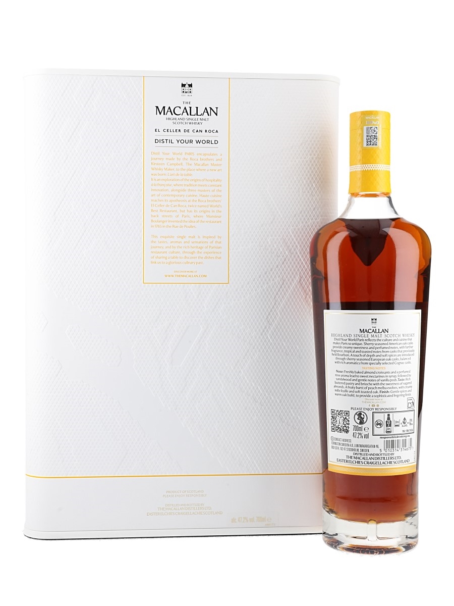 A bottle of The Macallan Distil Your World Paris Edition Highland Single Malt Scotch Whisky. This was matured in a marriage of sherry sesoned, bourbon and Cognac Casks, and bottled for The City of Paris in 2026 at 47.2% ABV. This was created in collaboration with Michelin-starred chefs and brothers Joan, Josep and Jordi Roca and took l’art de la table dining tradition for inspiration.