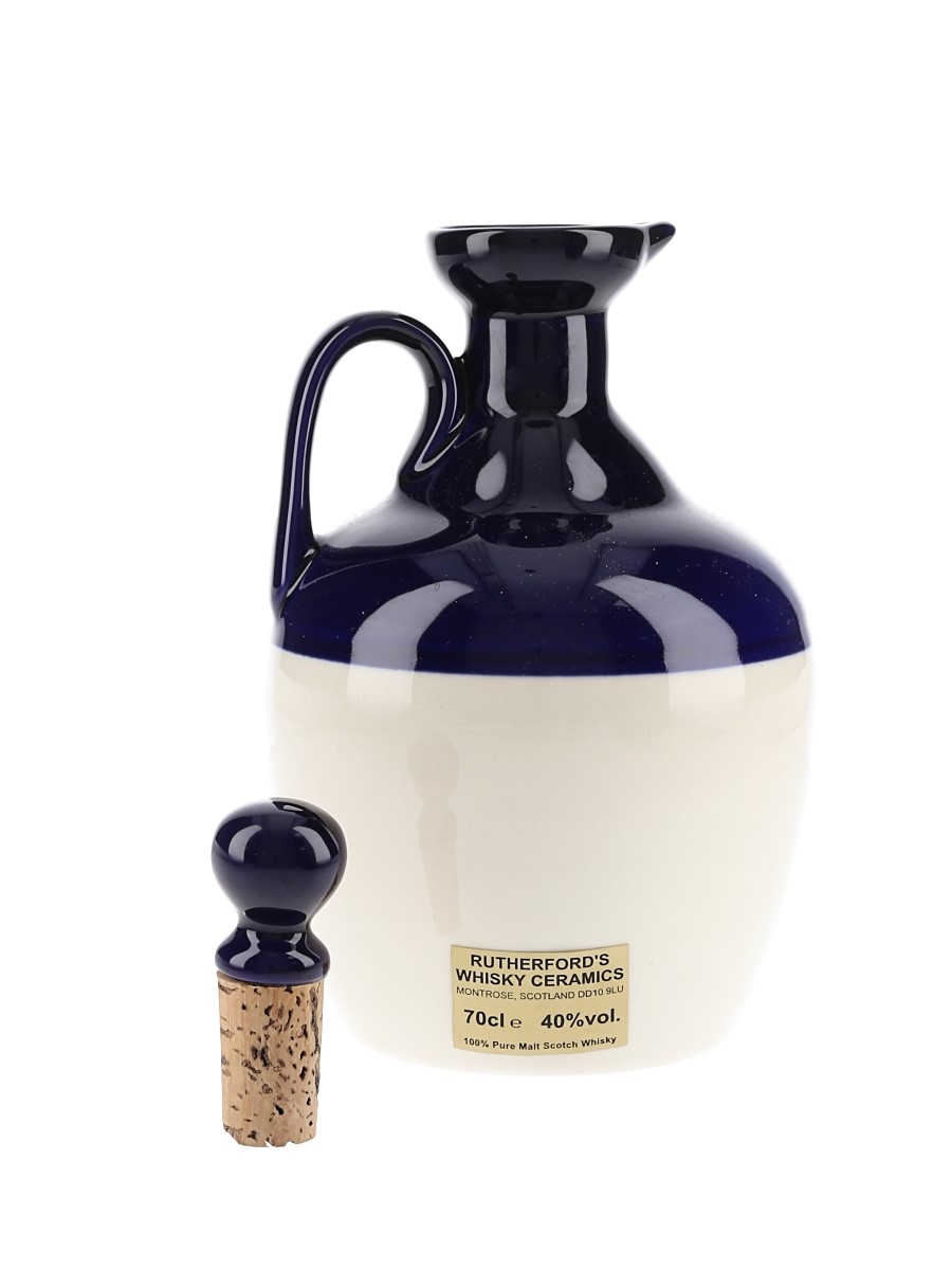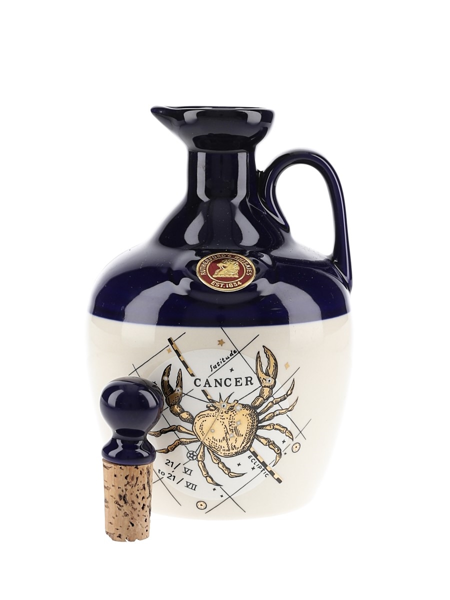 A bottle of Rutherford's blended Malt Scotch whisky in a ceramic decanter featuring the zodiac sign, Cancer.
