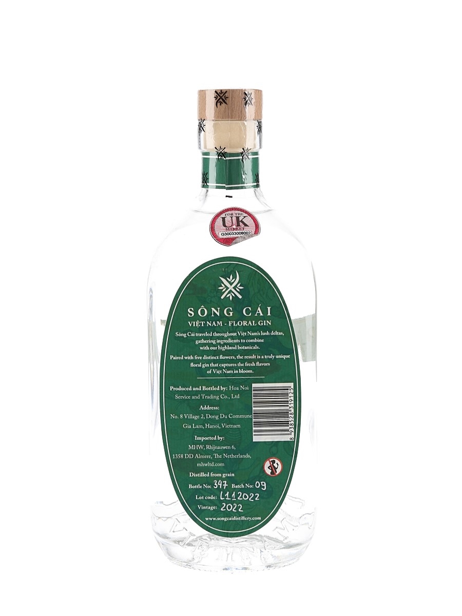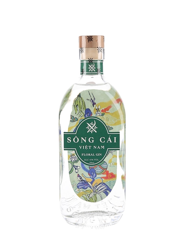 A bottle of Sông Cái Floral Gin produced in Vietnam and bottled at 45% ABV.