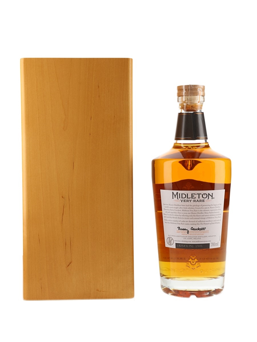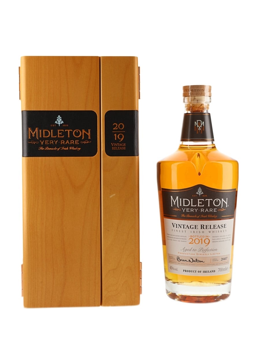 A bottle of Midleton Very Rare Irish Whiskey released in 2019. Every year since 1984, a new release has been produced and bottled in limited quantities.