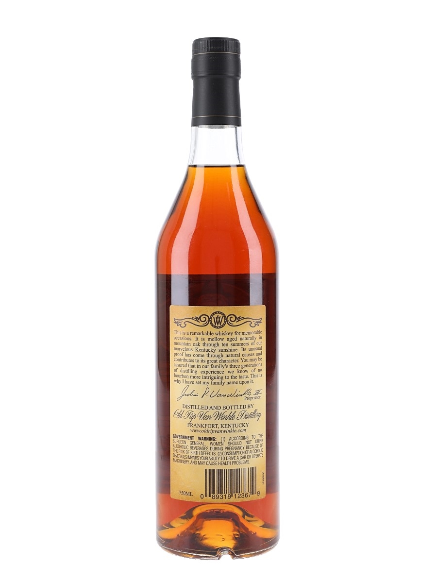 A bottle of Old Rip Van Winkle 10 Year Old Handmade Bourbon, distilled, aged and bottled by Old Rip Van Winkle Distillery, Frankfort. The bottling code indicates this was bottled in 2014.
