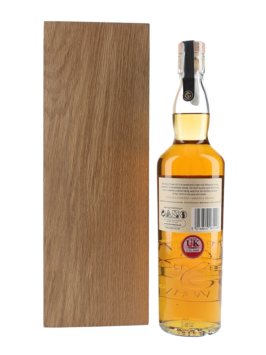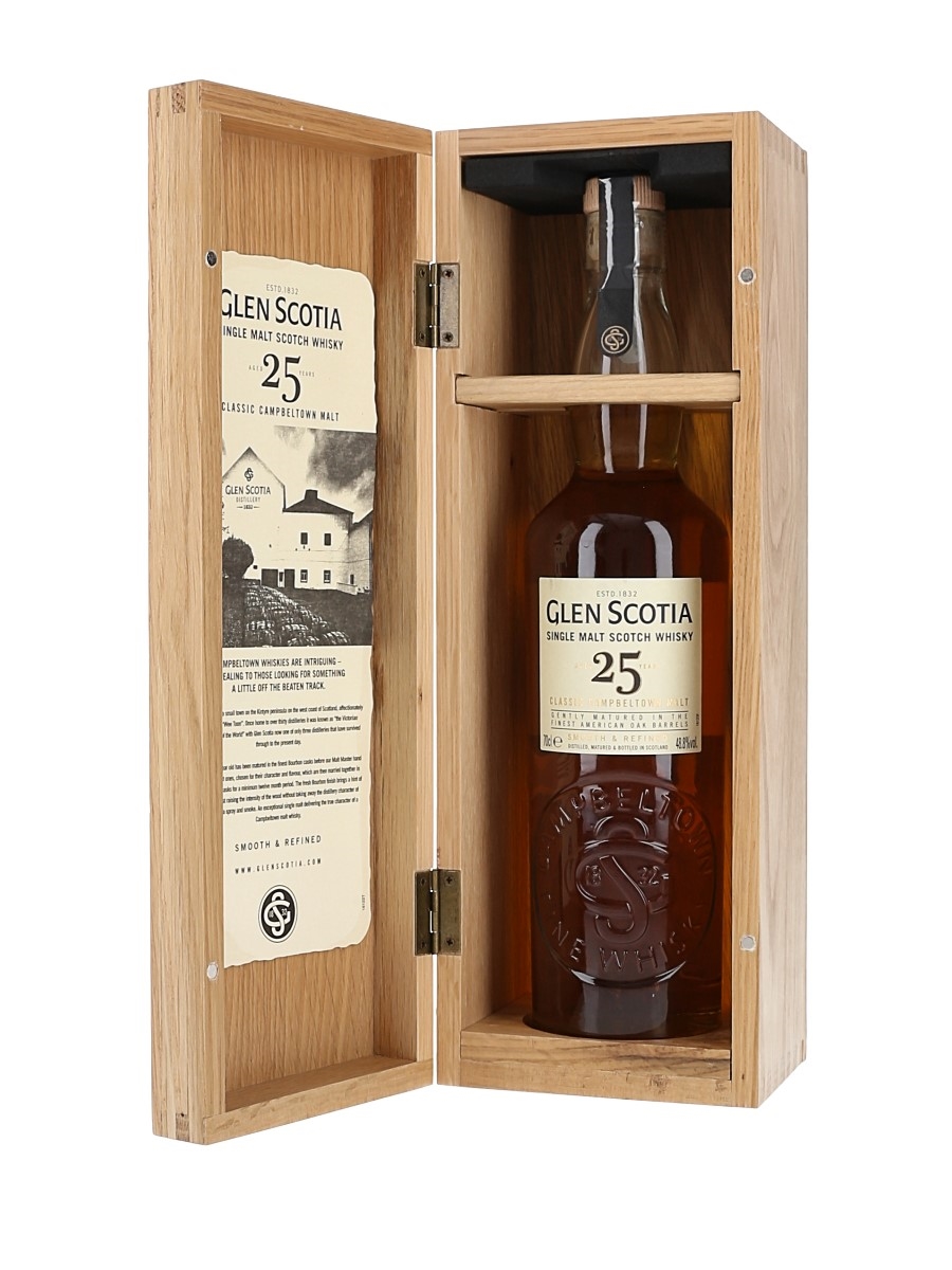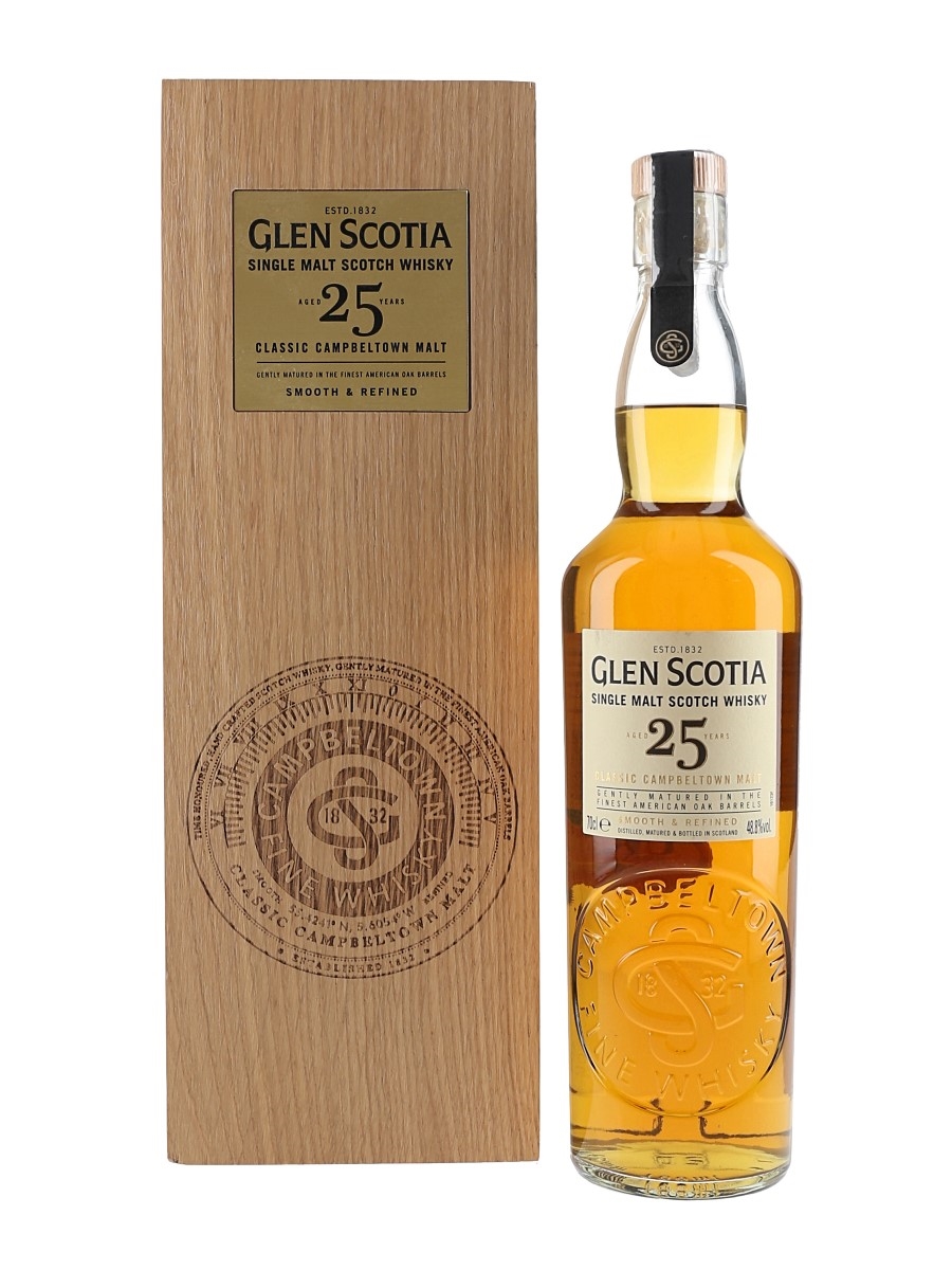 A bottle of Glen Scotia 25 Year Old Single Malt Scotch Whisky. This was matured in American oak barrels and bottled at 48.8% ABV in 2021.
