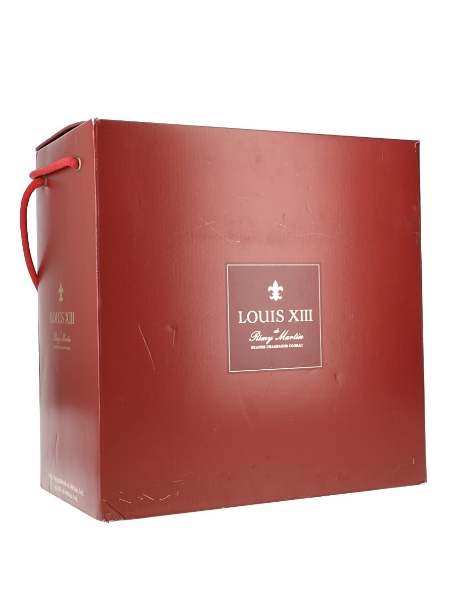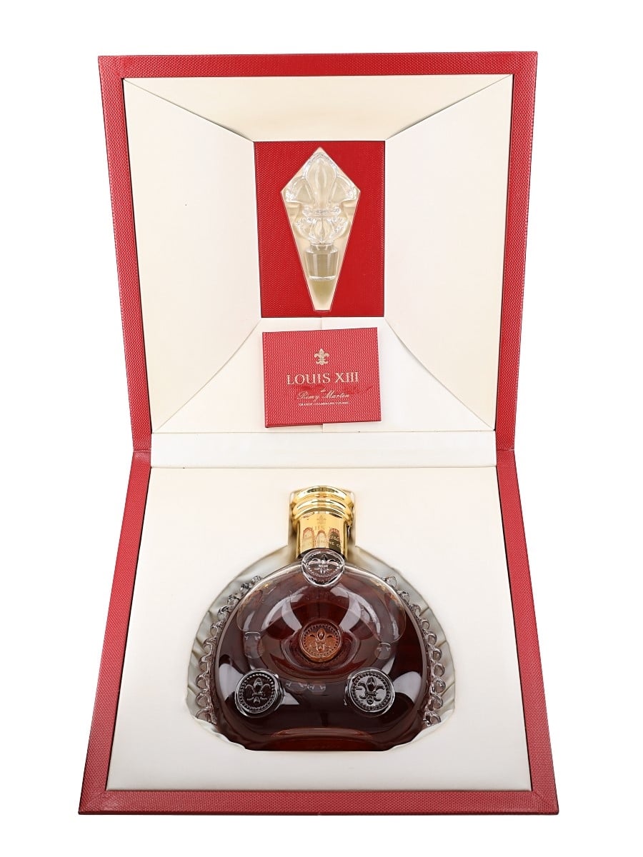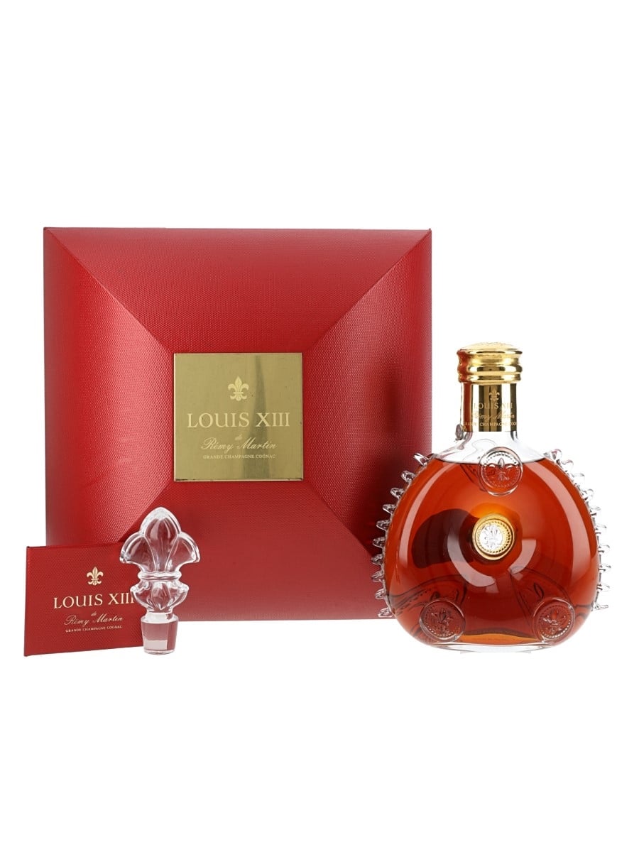 A bottle of Louis XIII de Rémy Martin Cognac. This is composed of Grande Champagne eaux-de-vie aged between 40 and 100 years and is presented in a Baccarat crystal decanter. This comes in a presentation box with a stopper and a numbered certificate.