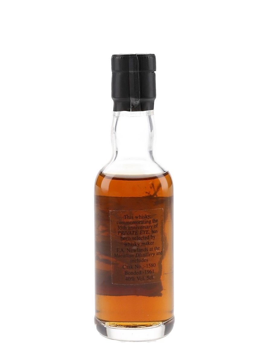A miniature bottle of The Macallan Single Highland Malt Scotch Whisky, released in 1996 to celebrate the 35th anniversary of satirical magazine, Private Eye. This is a vatting of casks selected by whisky maker FA Newlands and includes a cask from 1961, the year Private Eye was founded.