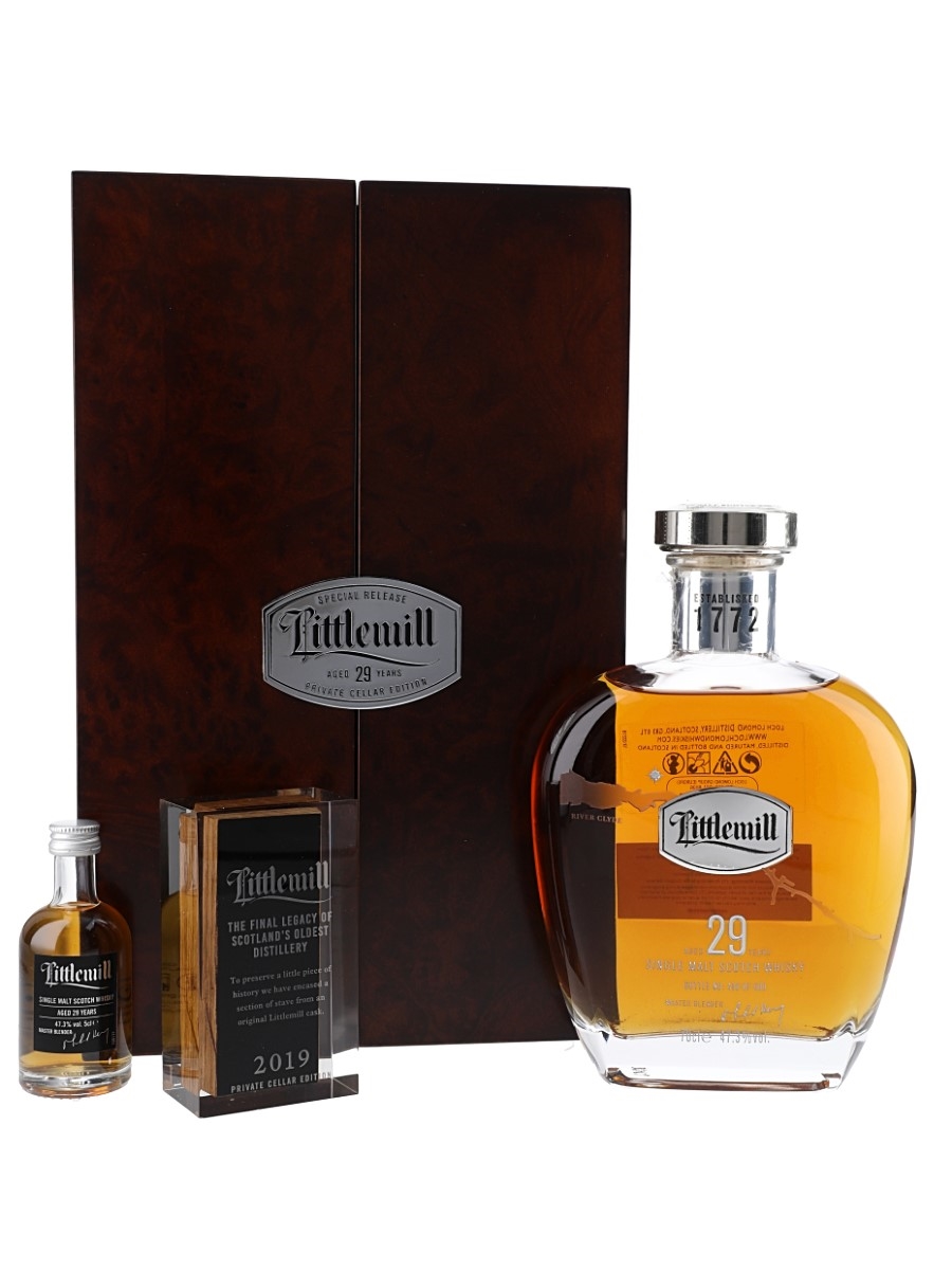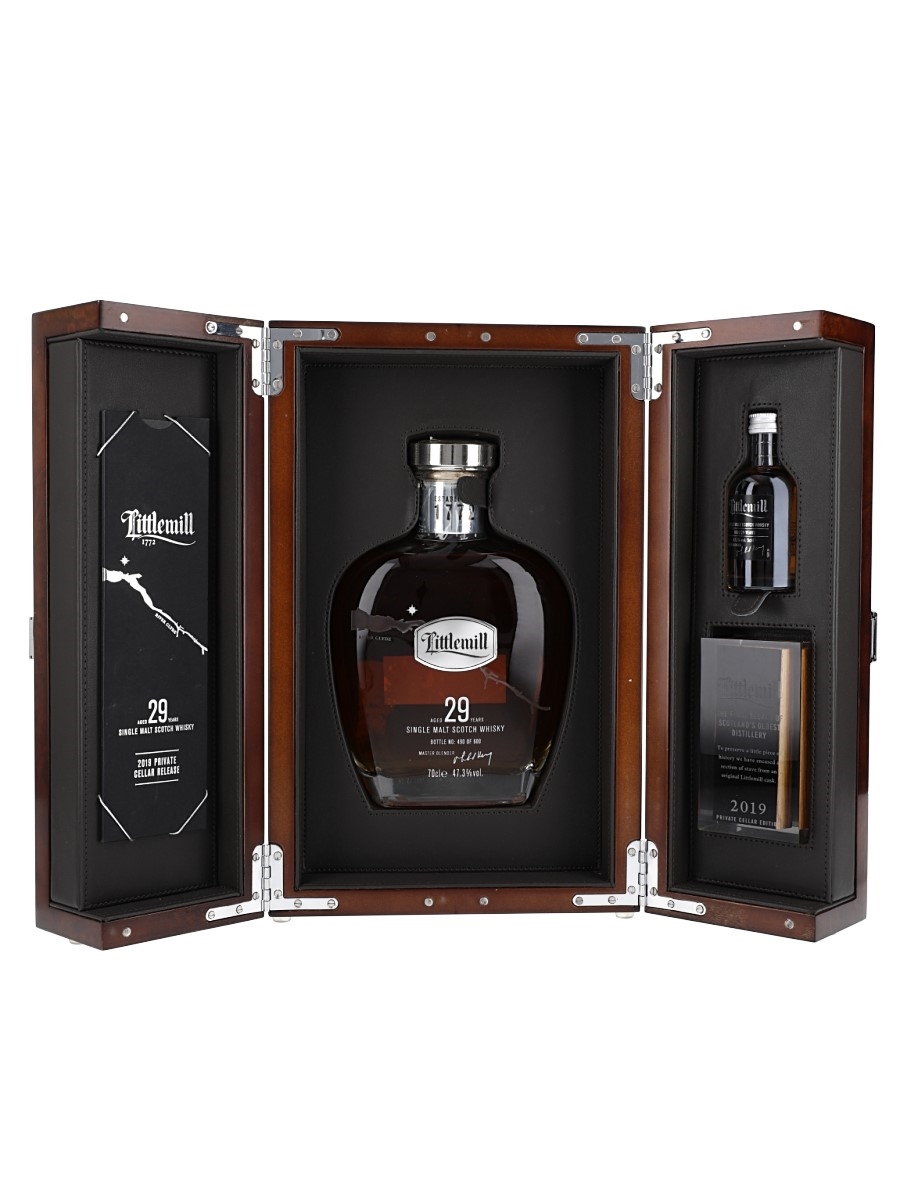 A set containing a bottle and a miniature bottle of Littlemill 29 Year Old Private Cellar Edition Lowland single malt Scotch Whisky. This was distilled in 1990, matured in seven refill bourbon casks and bottled in 2019 at 47.3% ABV.