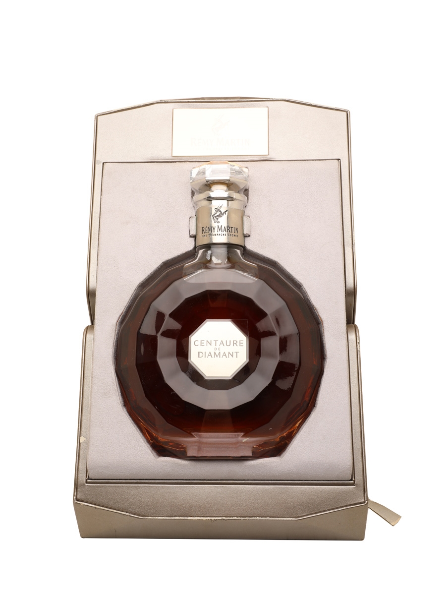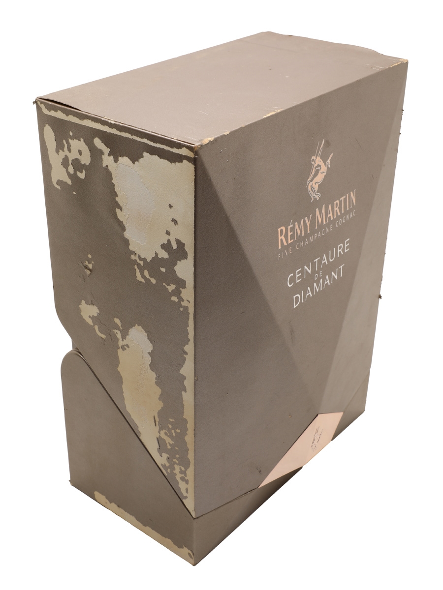 A decanter of Rémy Martin Centaure de Diamant Cognac in a presentation box. This is a blend of eaux-de-vie from Grande and Petite Champagne matured for between 20 and 50 years. The bottling code indicates this was bottled on 4 June 2012.