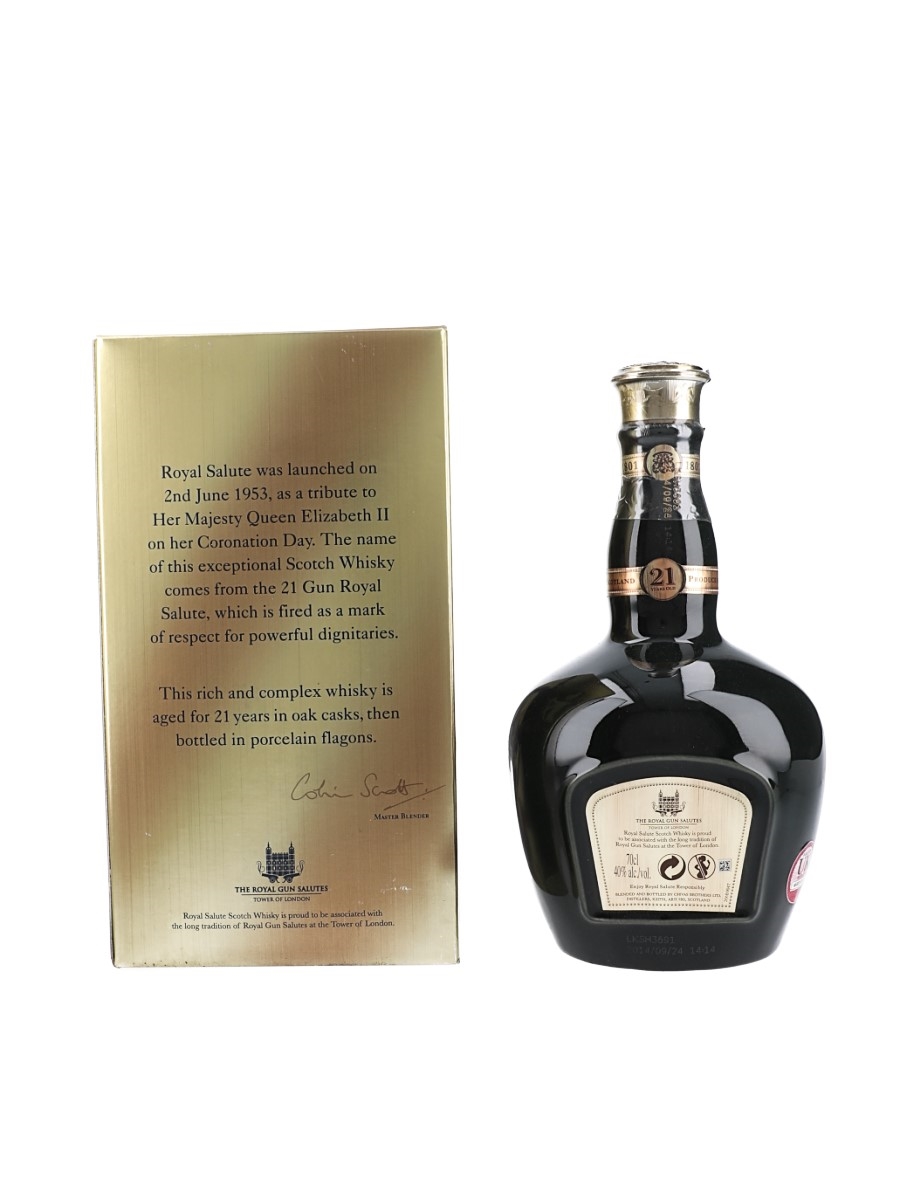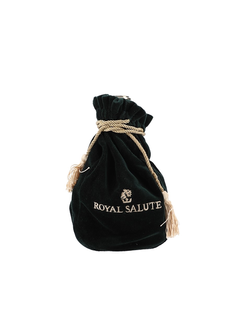 A bottle of Chivas Brothers' Royal Salute 21 Year Old, The Emerald Flagon, presented in a ceramic decanter in a velvet bag. This was bottled on 24 September 2014.