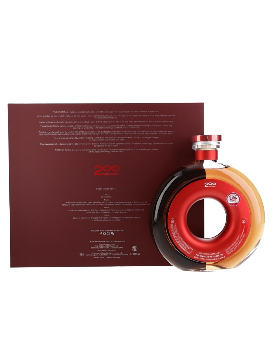 A bottle of The Macallan Time : Space - Mastery. This was released in 2024 to celebrate the 200th anniversary of the Macallan distillery. Fourteen types of cask have been married together, to create this unique Single Malt which celebrates the legacy of Macallan.