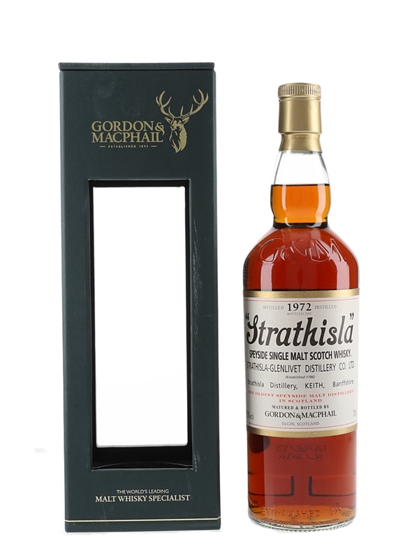A bottle of Strathisla 1972 Speyside Single Malt Scotch Whisky, bottled in 2013 by Gordon & MacPhail.