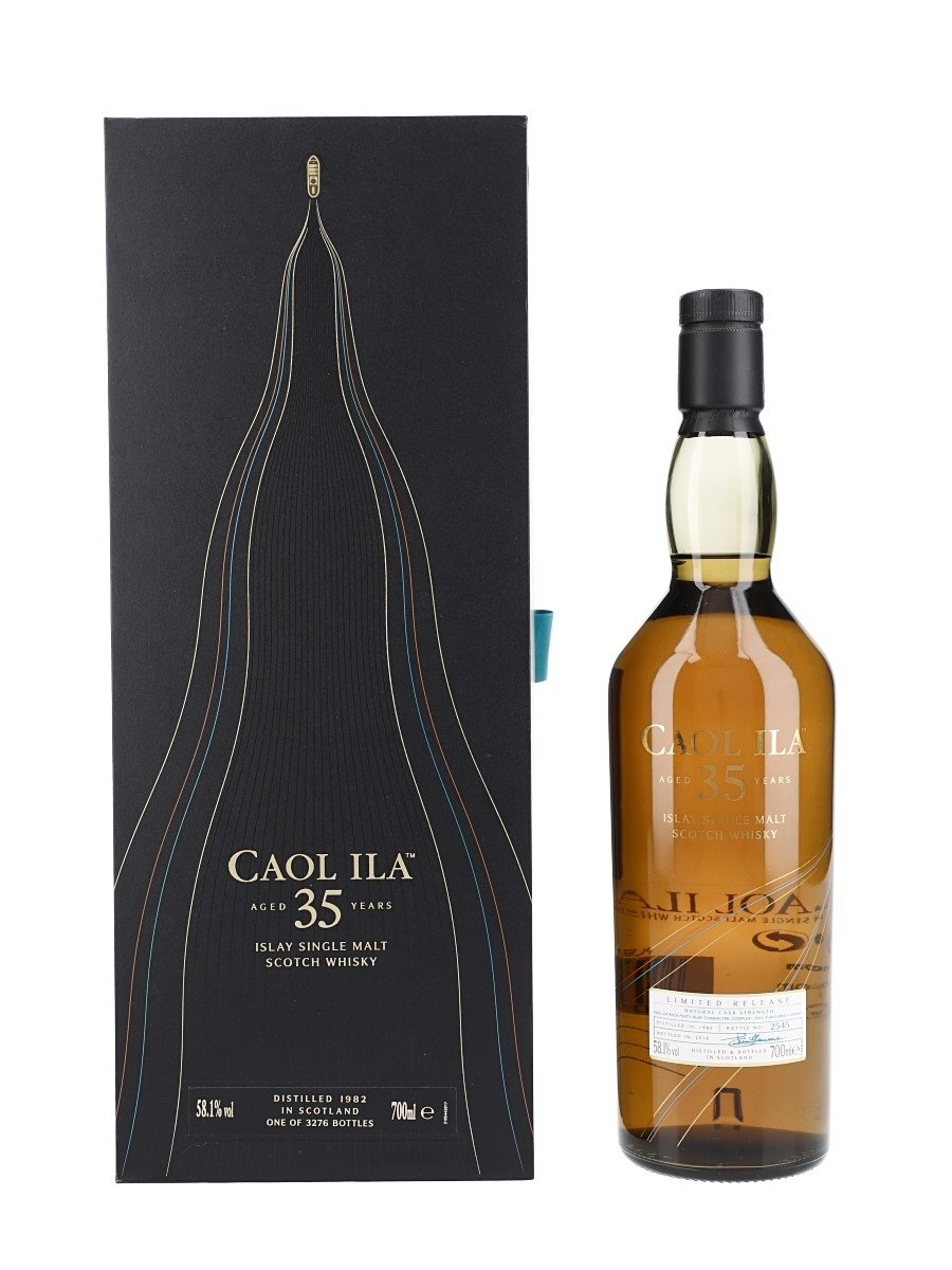 A bottle of Caol Ila 35 Year Old, limited release, Islay Single Malt Scotch Whisky. This was distilled in 1982 and bottled in 2018 as part of Diageo's Special Releases series.