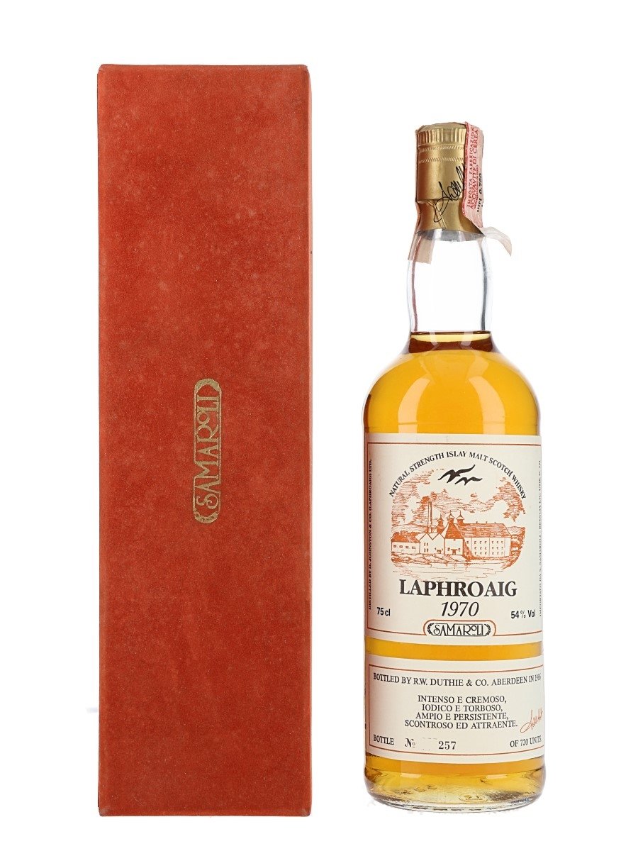 A bottle of Laphroaig Natural Strengtht Islay Malt Scotch Whisky. This was dislilled in 1970 and bottled in 1986 by R W Duthie & Co for Italian importer Samaroli.