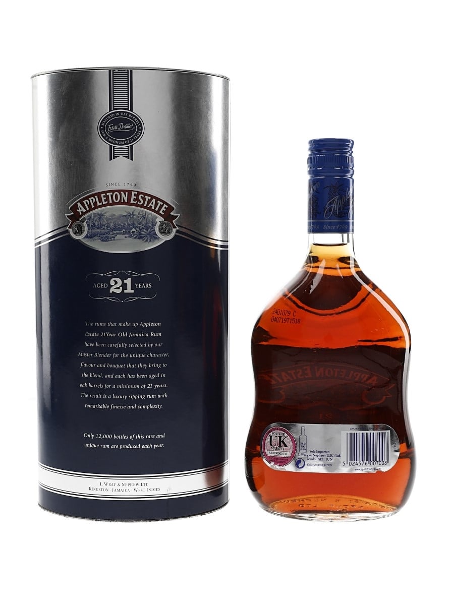 A bottle of Appleton Estate 21 Year Old Jamaica rum, distilled, blended, and bottled by Wray & Nephew. This was bottled in 2006.
