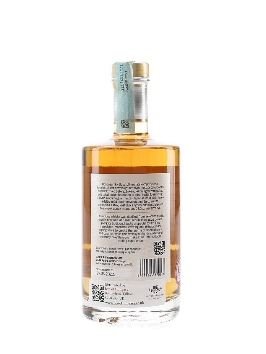 A 50cl bottle of Agárdi Single Malt Whisky. This was matured in Tokaj Aszú barrels and bottled at 43% on 27 June 2022.