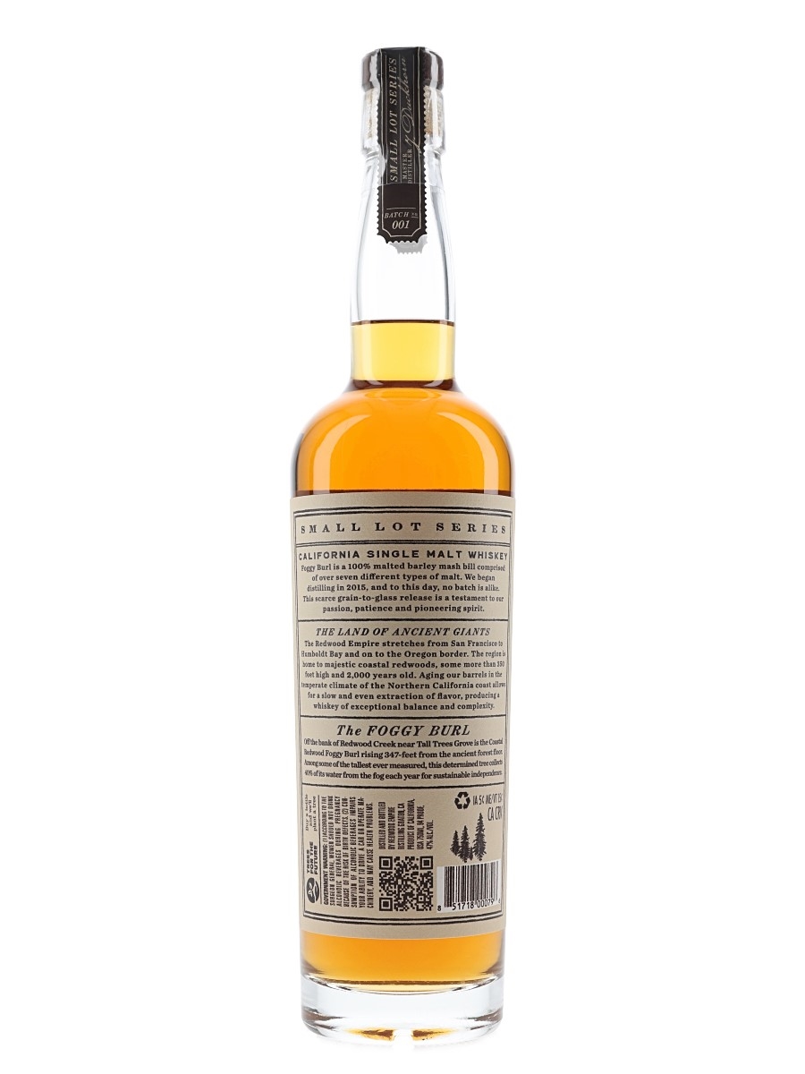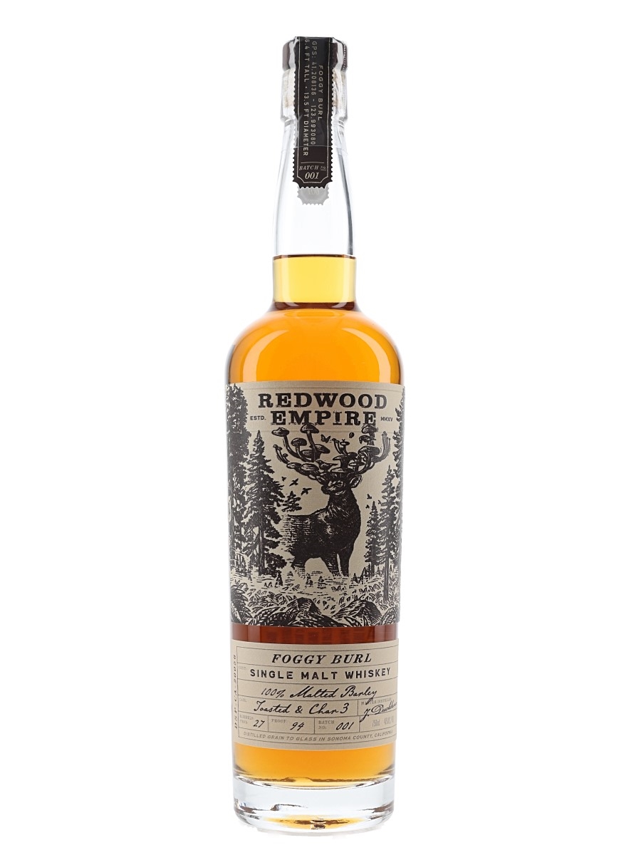 A bottle of Redwood Empire Foggy Burl Single Malt Whiskey.