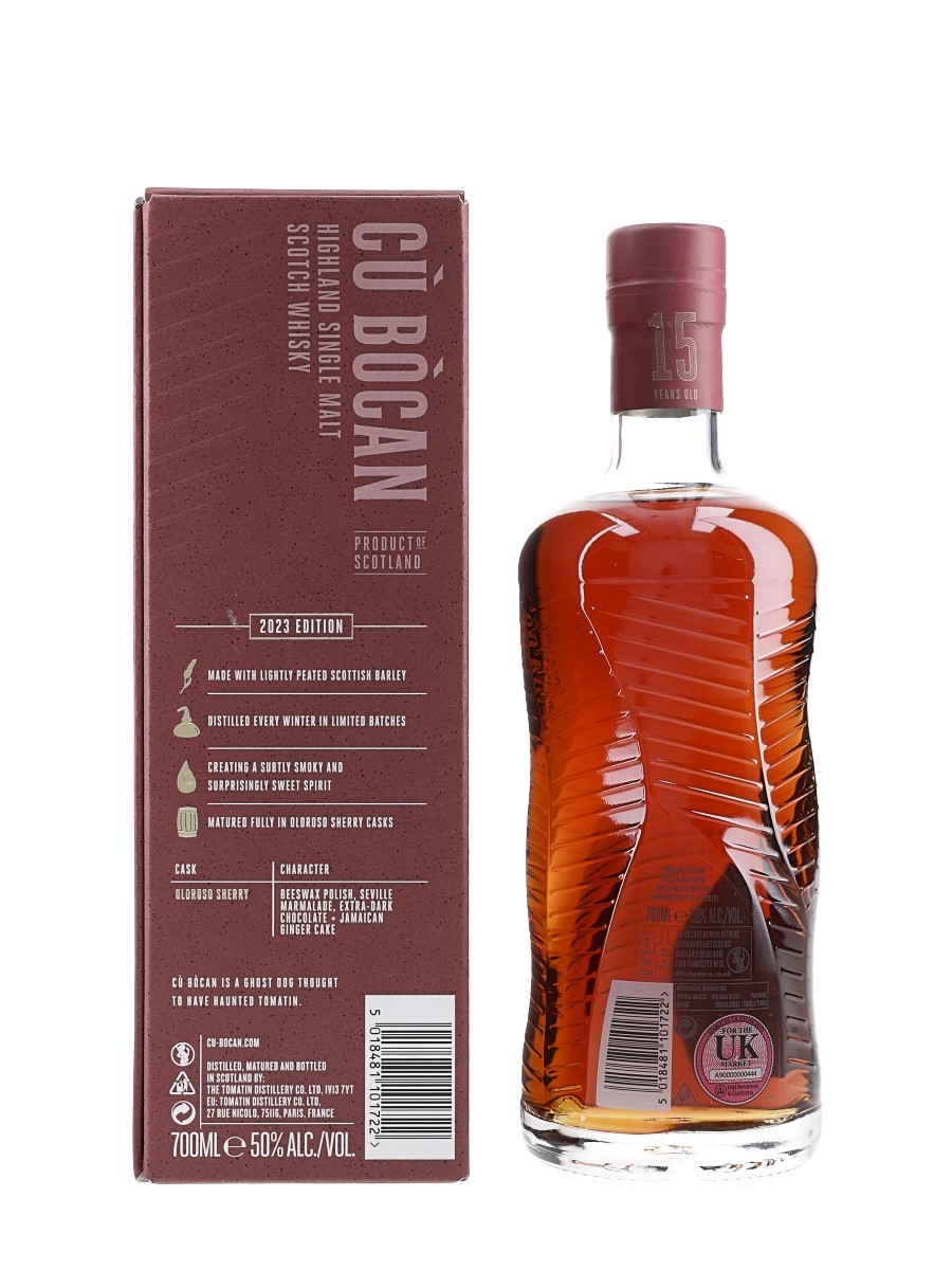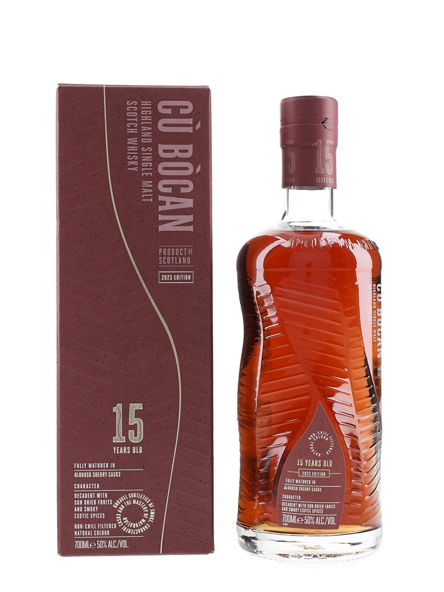 A bottle of Cù Bòcan 15 Year Old Highland Single Malt Scotch Whisky distilled at Tomatin Distillery. This was fully matured in oloroso sherry casks before being bottled at 50% ABV. This is the 2023 edition.