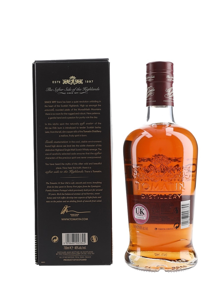 A bottle of Tomatin 14 Year Old Single Malt Scotch Whisky, finished in tawny port casks.