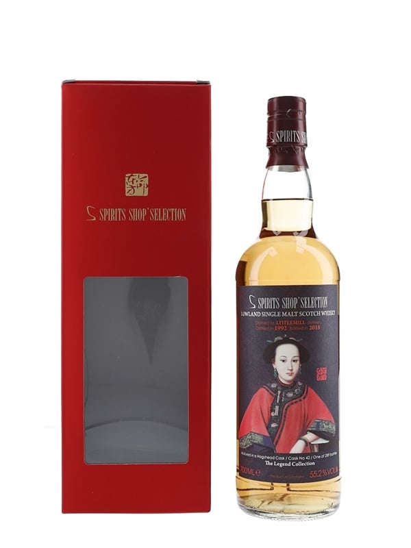 A bottle of Littlemill Lowland Single Malt Scotch Whisky. This was distilled in 1992, matured in a single Hogshead cask and bottled in 2018 by the Spirits Shop Selection as part of the Legend Collection.