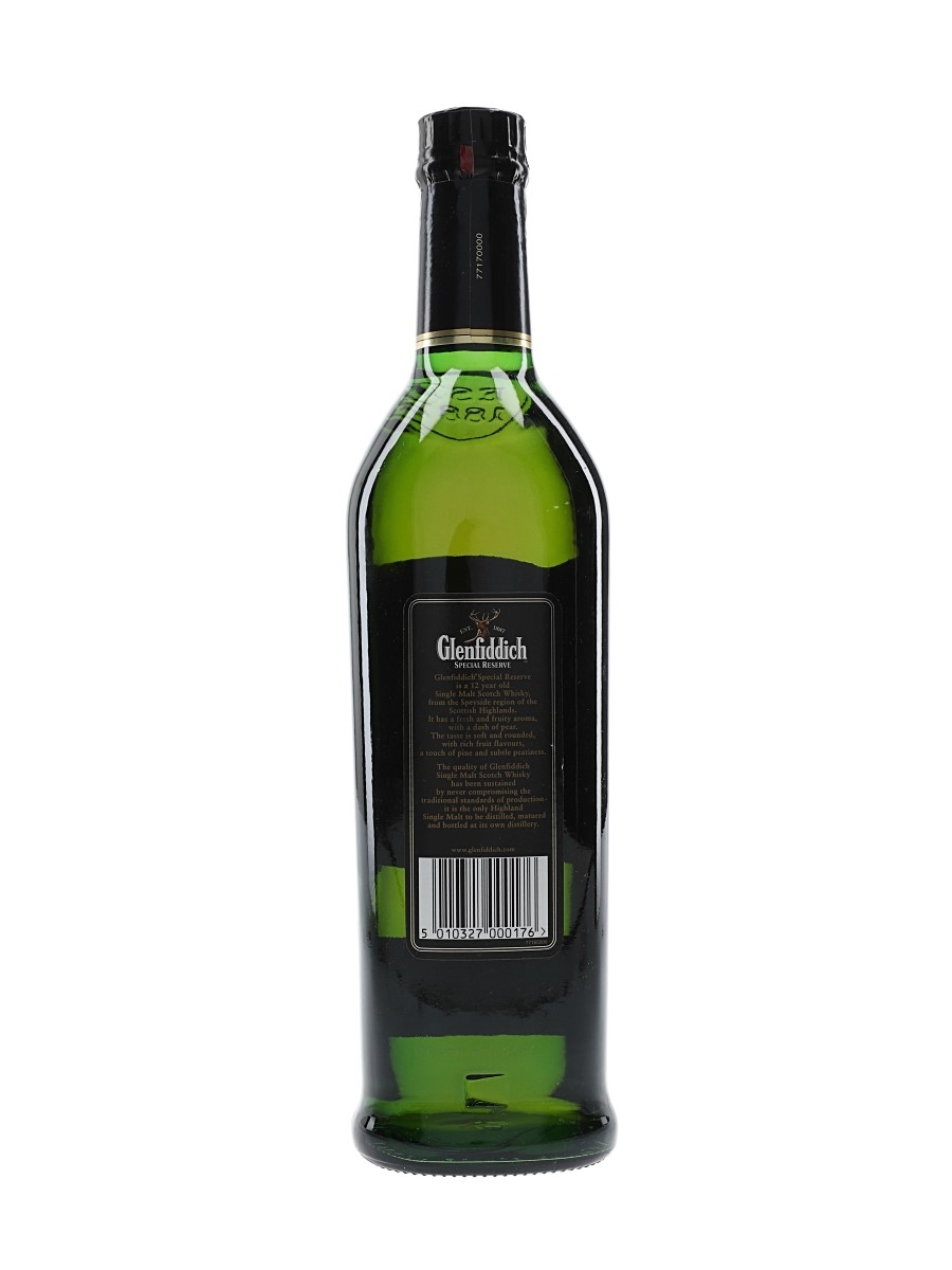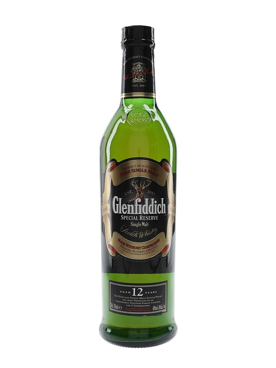 A bottle of Glenfiddich 12 Year Old Single Malt Scotch Whisky.