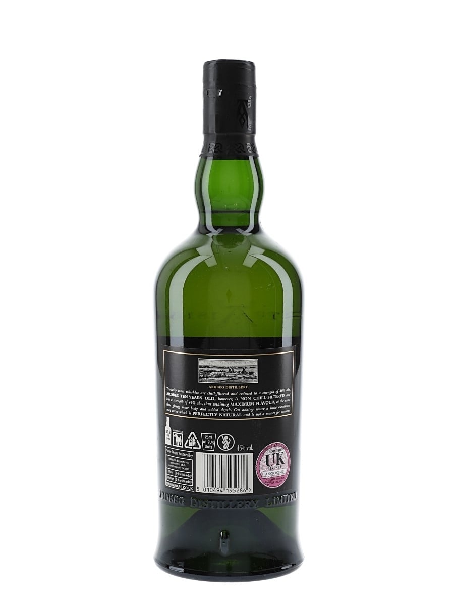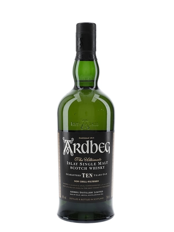 A bottle of Ardbeg 10 Year Old Single Islay Malt Scotch Whisky. The bottling code indicates this was bottled in 2016.