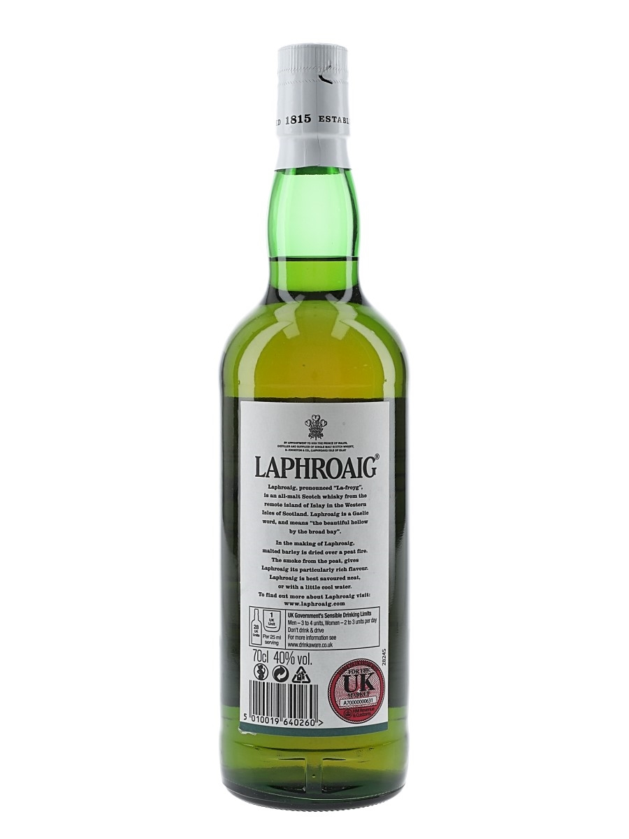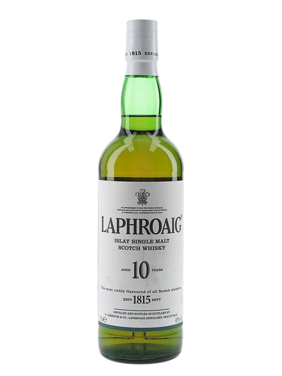 A bottle of Laphroaig 10 Year Old Single Islay Malt Scotch Whisky.