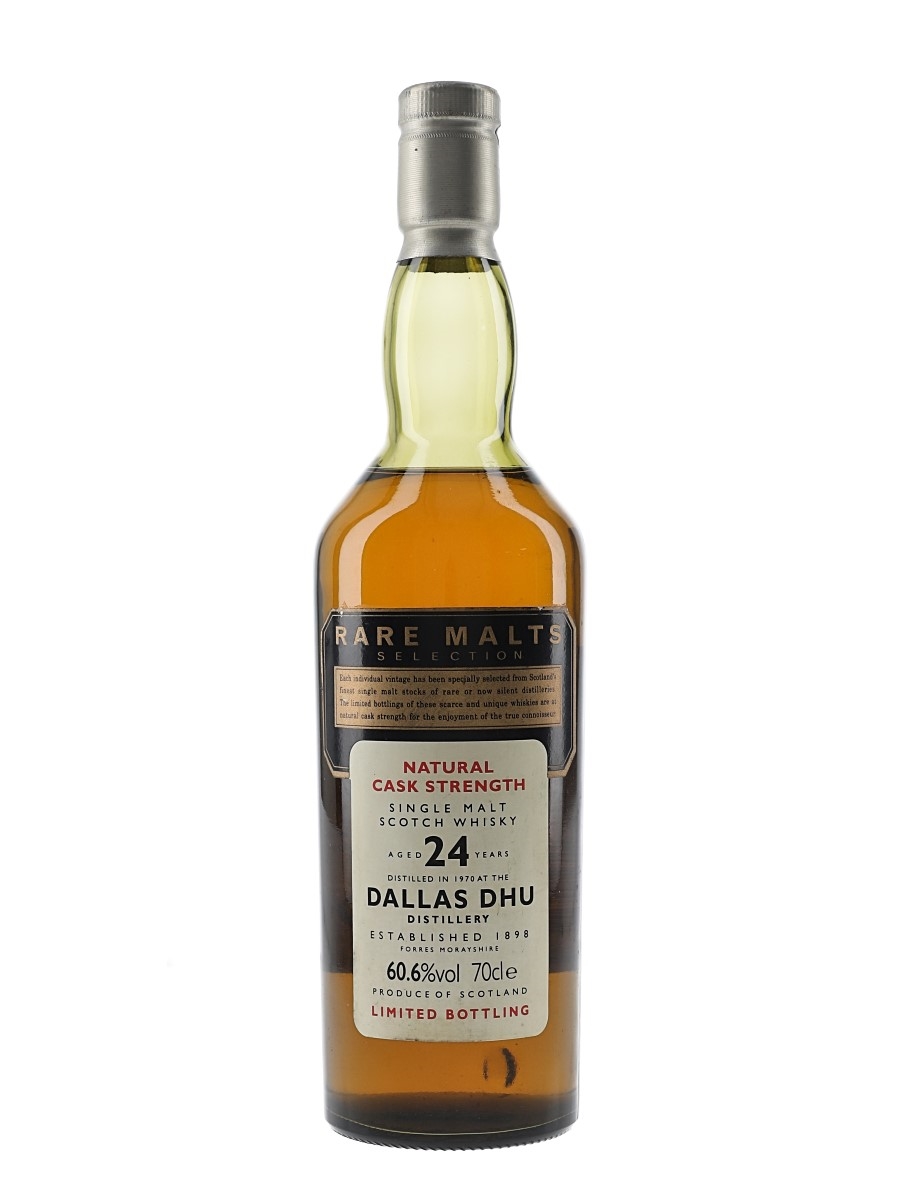 A bottle of Dallas Dhu 24 Year Old Single Malt Scotch Whisky. This was distilled in 1970 and bottled at 60.6% ABV as part of the Rare Malts Selection.
