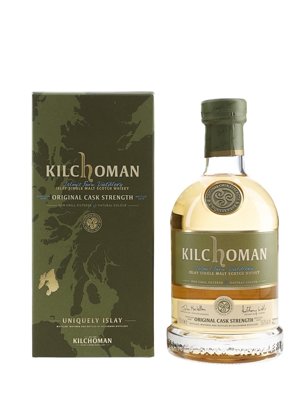 A bottle of Kilchoman Original Cask Strength Single Malt Scotch Whisky. This was distilled in 2009, matured in 5 bourbon barrels and bottled at cask strength of 59.2% ABV in 2014.