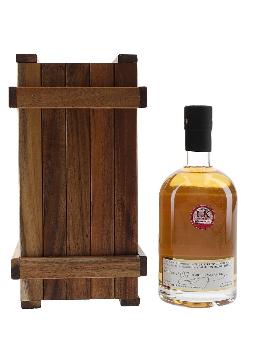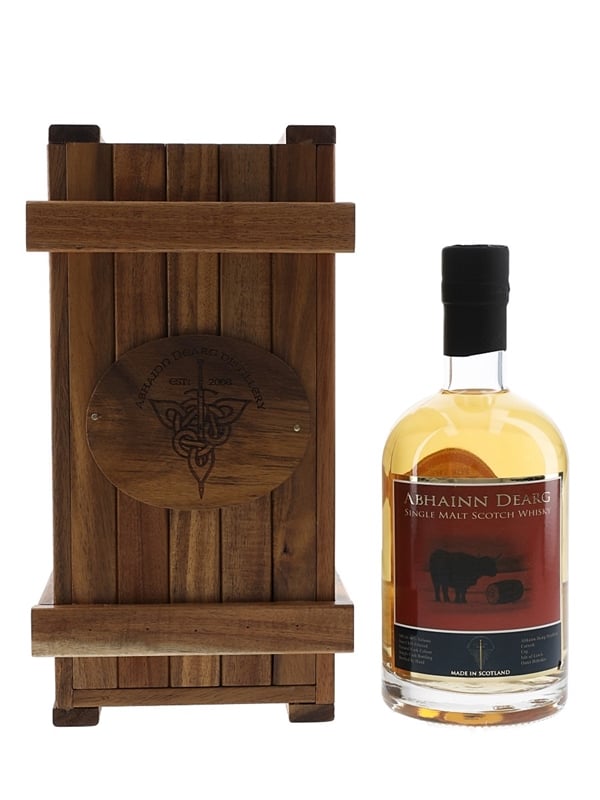 A 50cl bottle of Abhainn Dearg Single Malt Scotch Whisky, the first legal single malt whisky made at the Abhainn Dearg (Red River) distillery in Uig on the Outer Hebridean Isle of Lewis. Established in 2008, Abhainn Dearg is the most westerly distillery in Scotland.