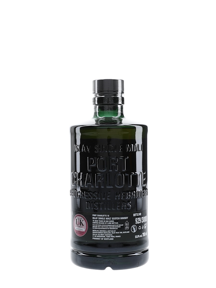 A bottle of Port Charlotte 16 Year Old Heavily Peated Islay Single Malt Scotch Whisky.