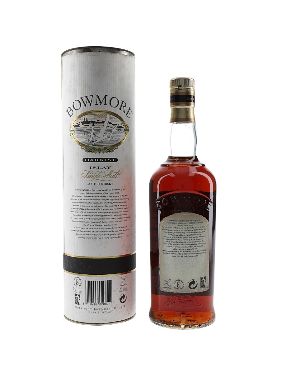 A bottle of Bowmore Darkest Islay Single Malt Scotch Whisky, a sherry cask-finished whisky with no age statement. We estimate this was bottled in the 1990s.