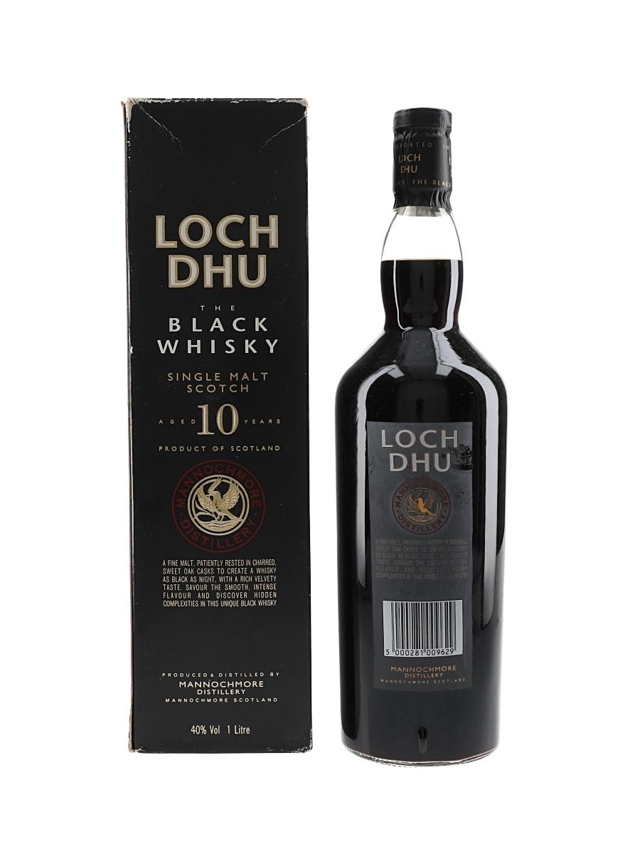 A litre bottle of Loch Dhu 10 Year Old. Known as the 'Black Whisky' due to its colour, this was produced by Diageo at Mannochmore distillery in the mid 1990s. The colour is said to derive from the charred-oak casks used to mature the spirit, although it is known that a quantity of spirit caramel was added to achieve this hue.