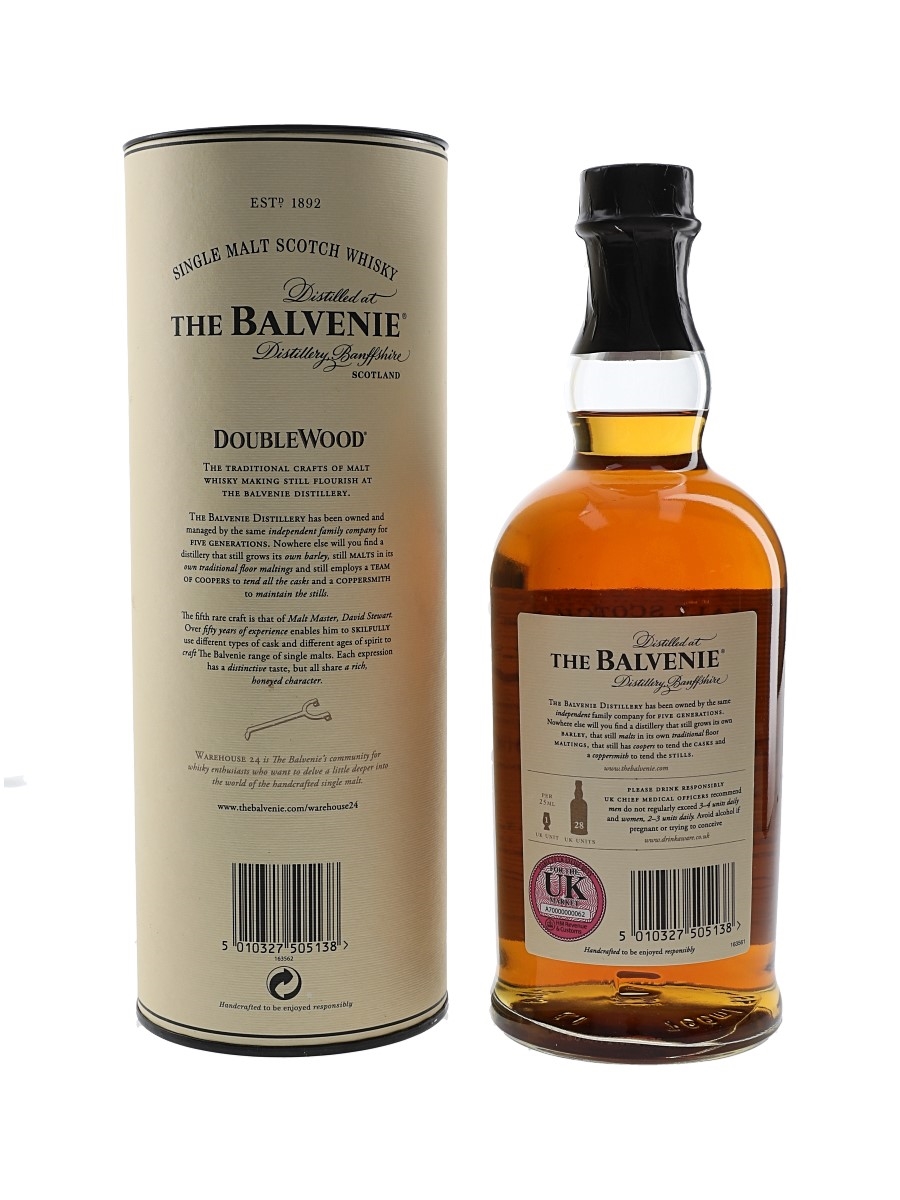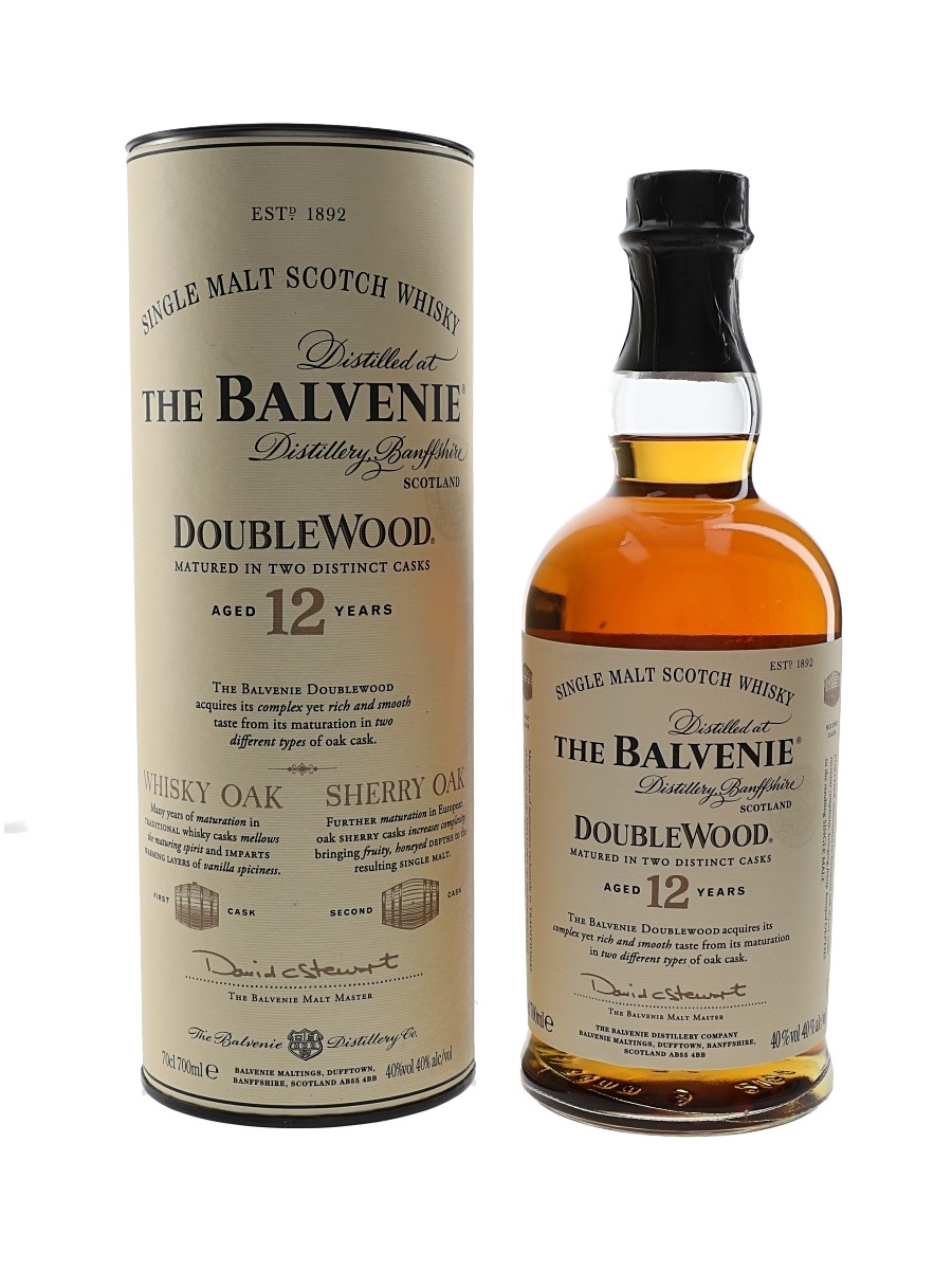 A bottle of The Balvenie 12 Year Old Doublewood Single Malt Scotch Whisky. This was matured first in traditional whisky oak casks, followed by a period of ageing in sherry casks.