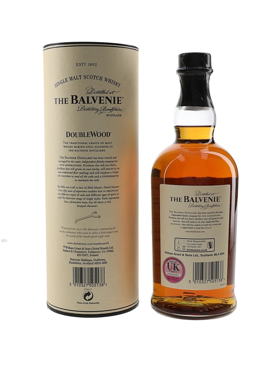 A bottle of The Balvenie 12 Year Old Doublewood Single Malt Scotch Whisky. This was matured first in traditional whisky oak casks, followed by a period of ageing in sherry casks.